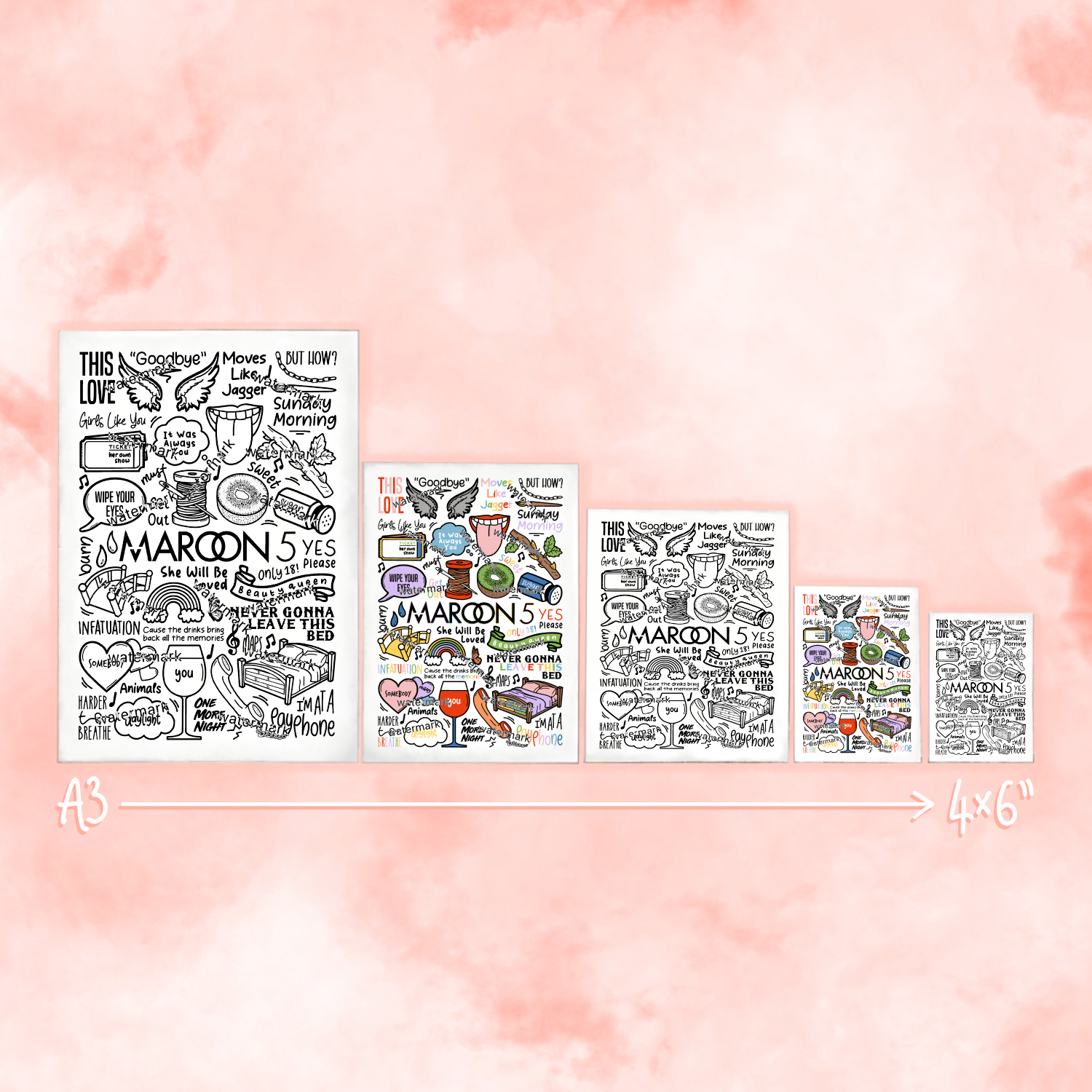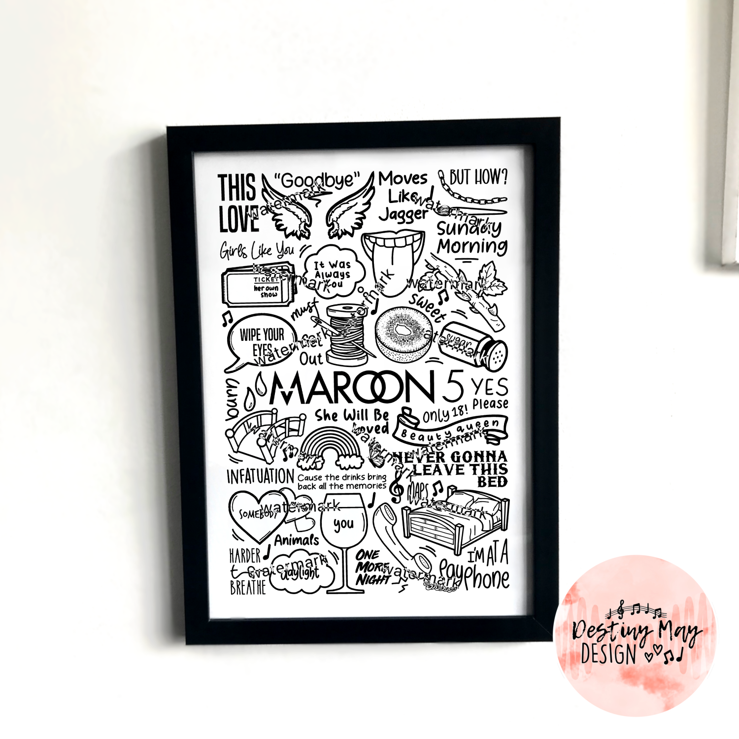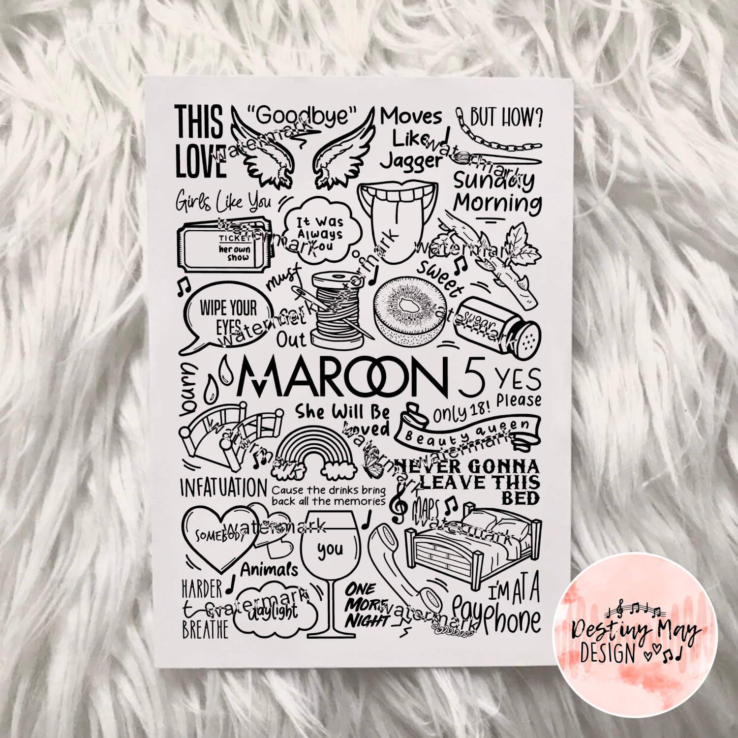 Affiche de Maroon 5 comprenant des images, des paroles et des titres de chansons de leurs albums.