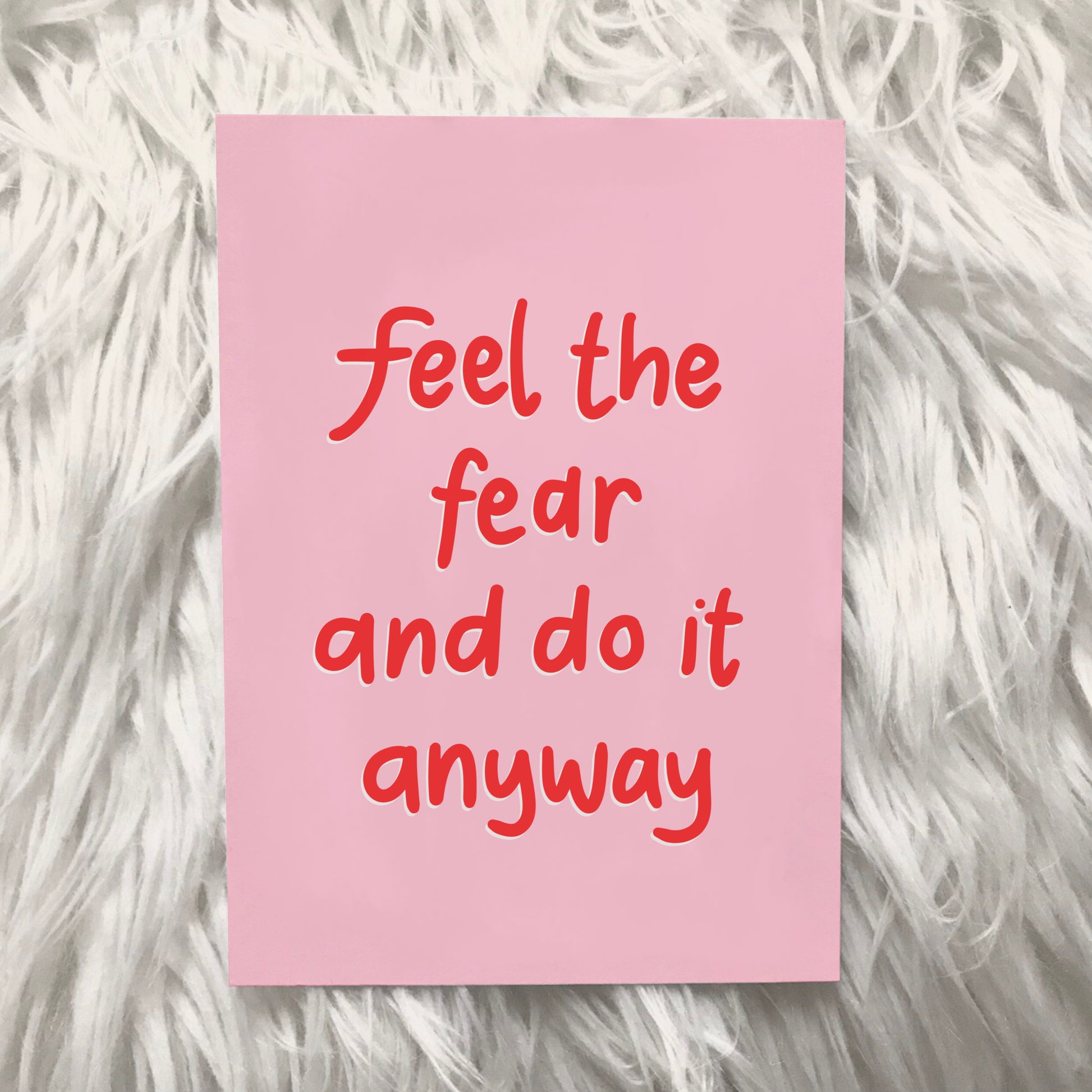 🌹Citation motivante et positive « Ressentez la peur et faites-le quand même » dans une police rouge manuscrite sur fond rose.