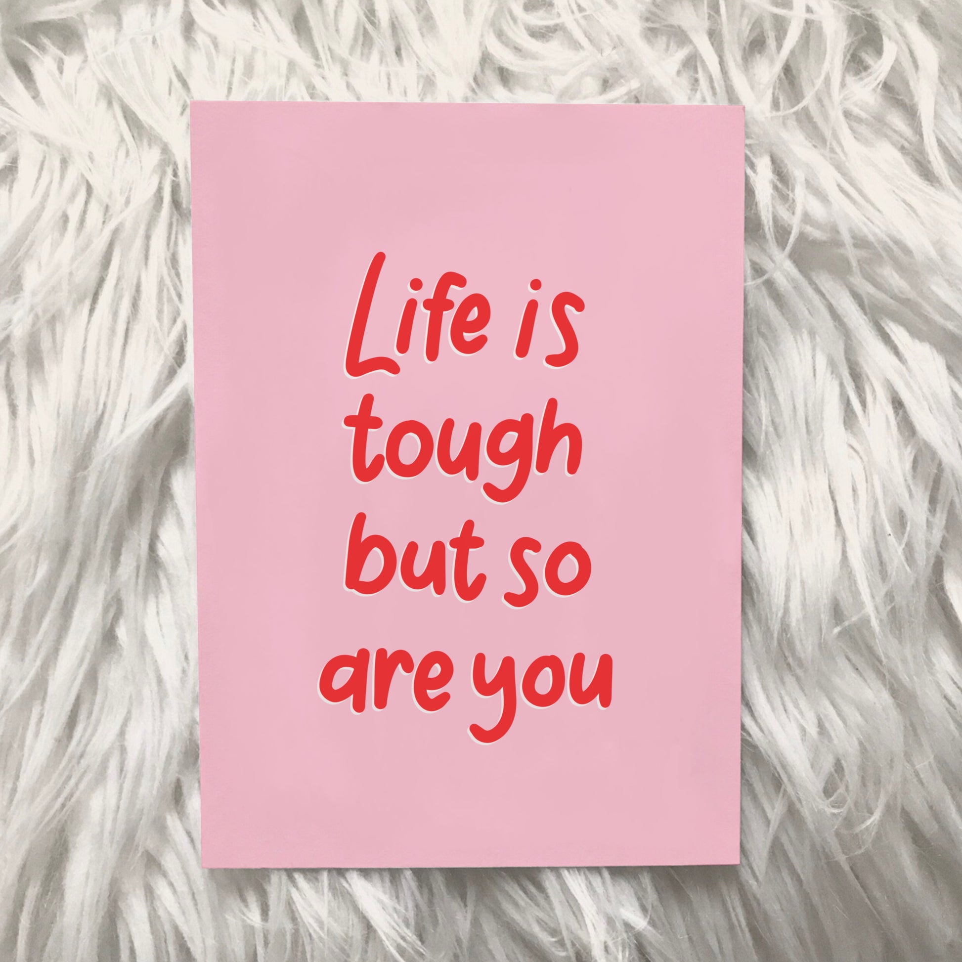 🌹Citation motivante et positive imprimée comprenant la citation « La vie est dure mais vous aussi » dans une police rouge manuscrite sur fond rose.