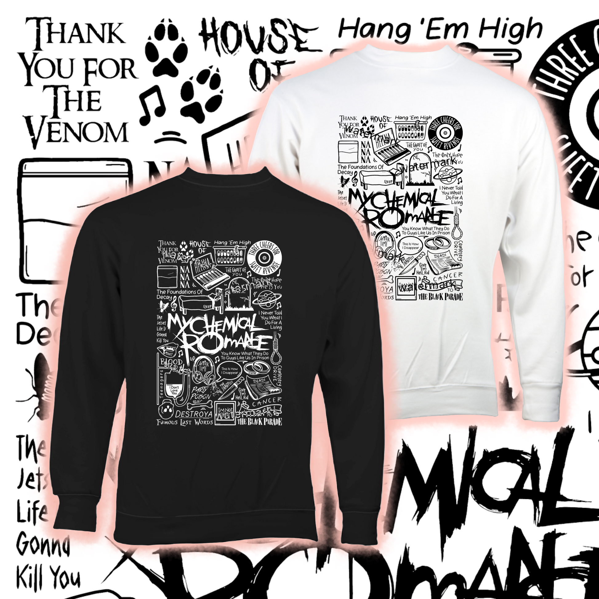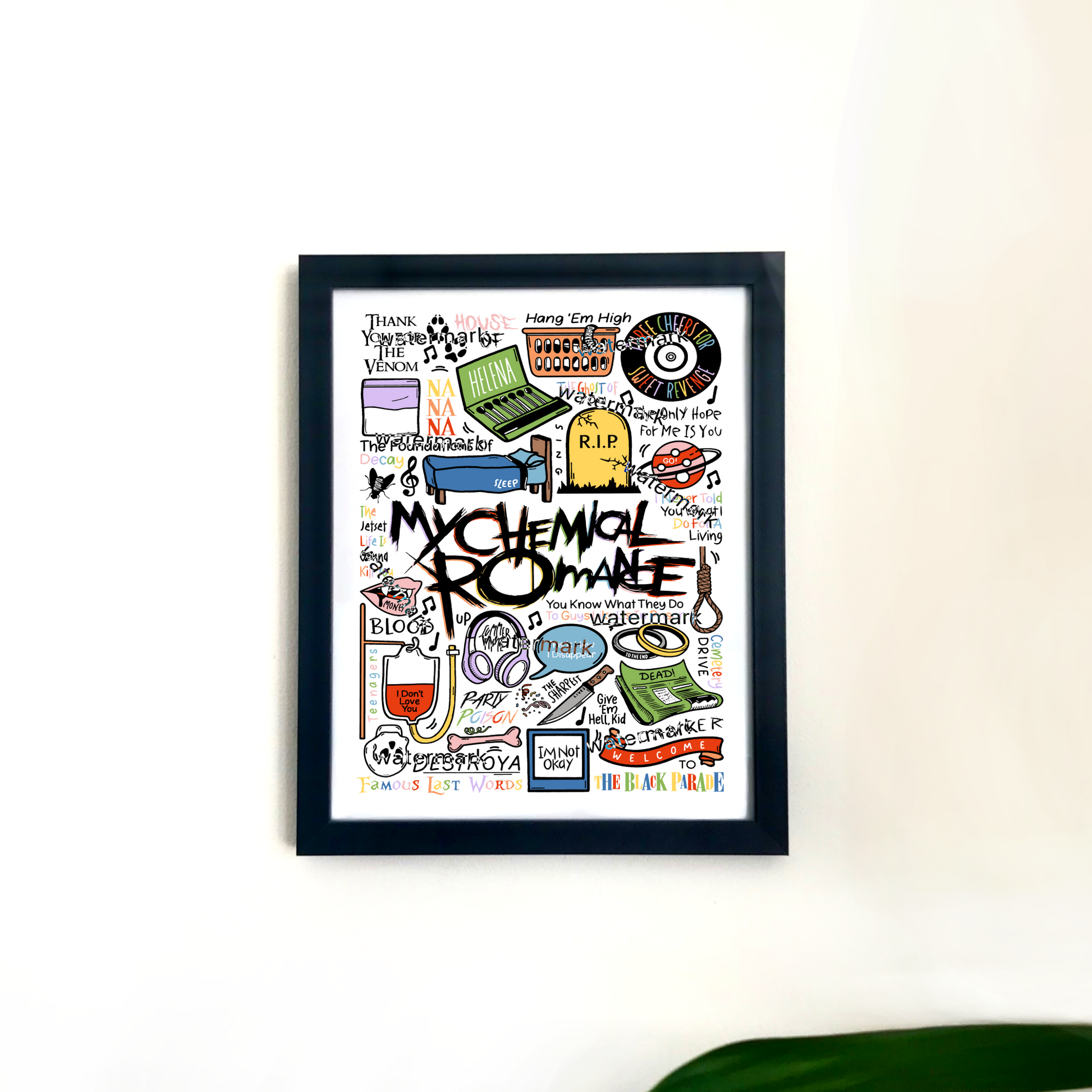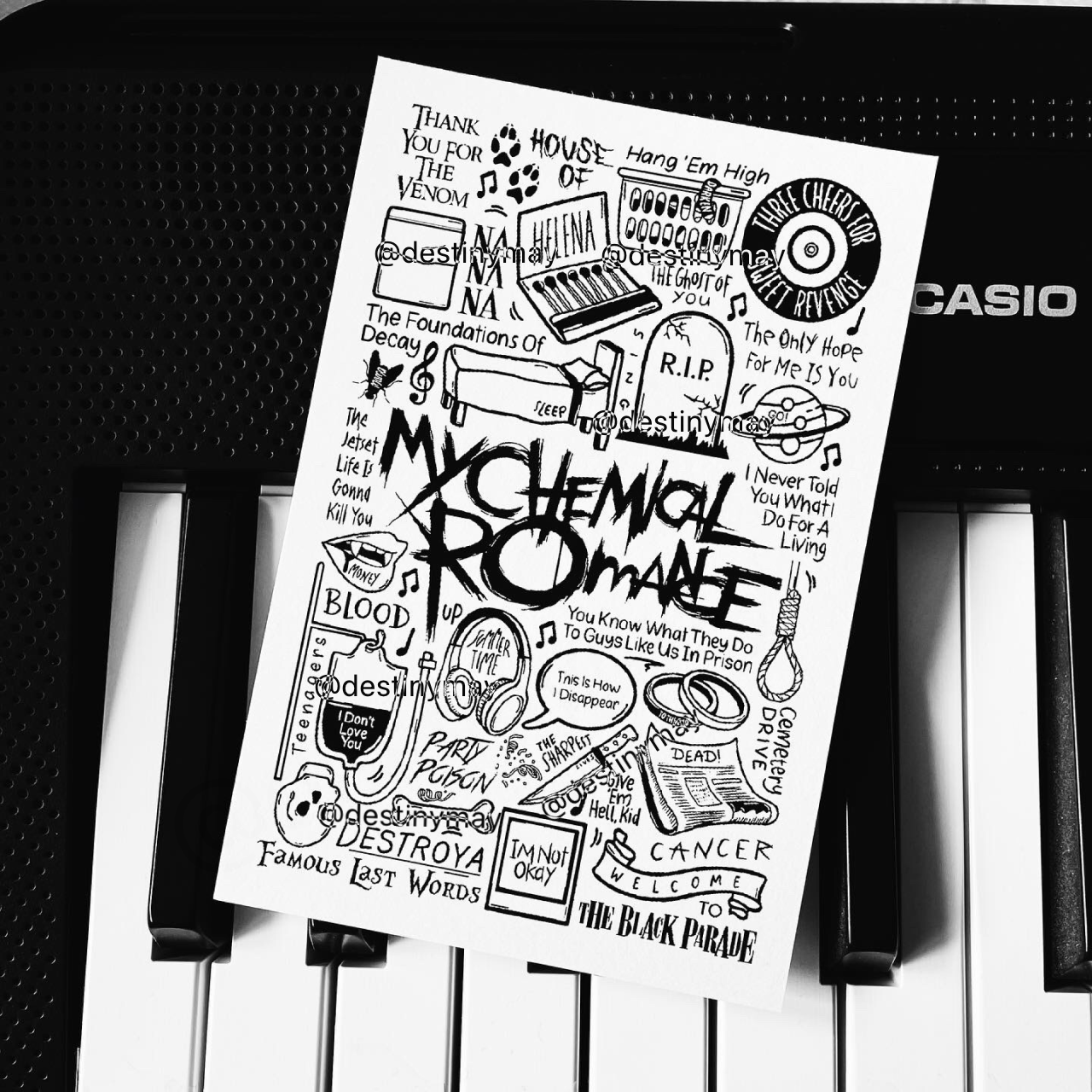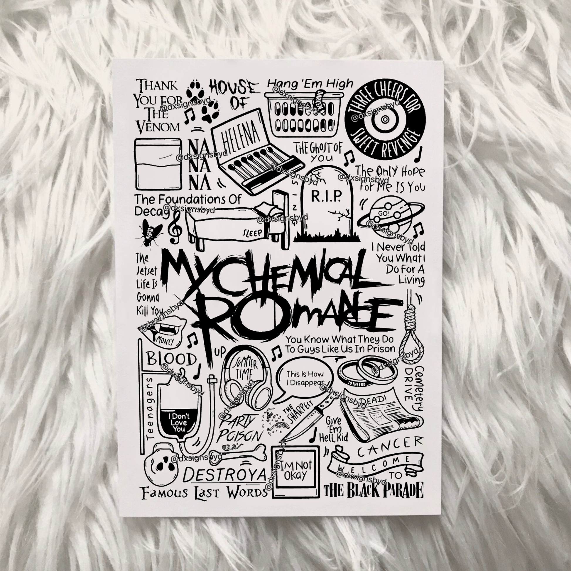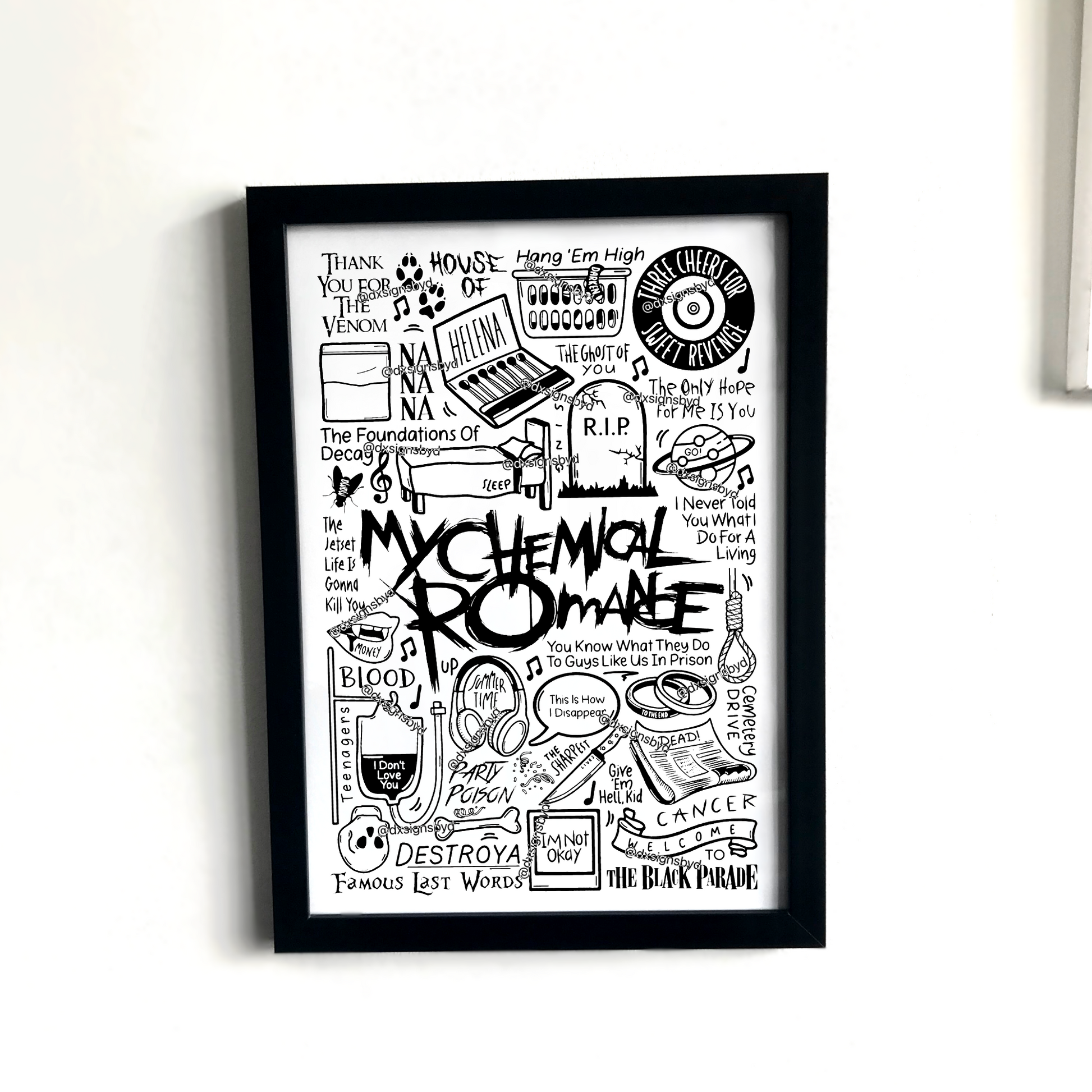 🎶Affiche MCR qui comprend des images et des paroles de chansons de leurs albums tels que Three Cheers For Sweet Revenge, Danger Days: The True Lives Of The Fabulous Killjoys et I Brought You Bullets, You Brought Me Your Love, avec des chansons telles que Welcome To The Black Parade, Teenagers et Helena.