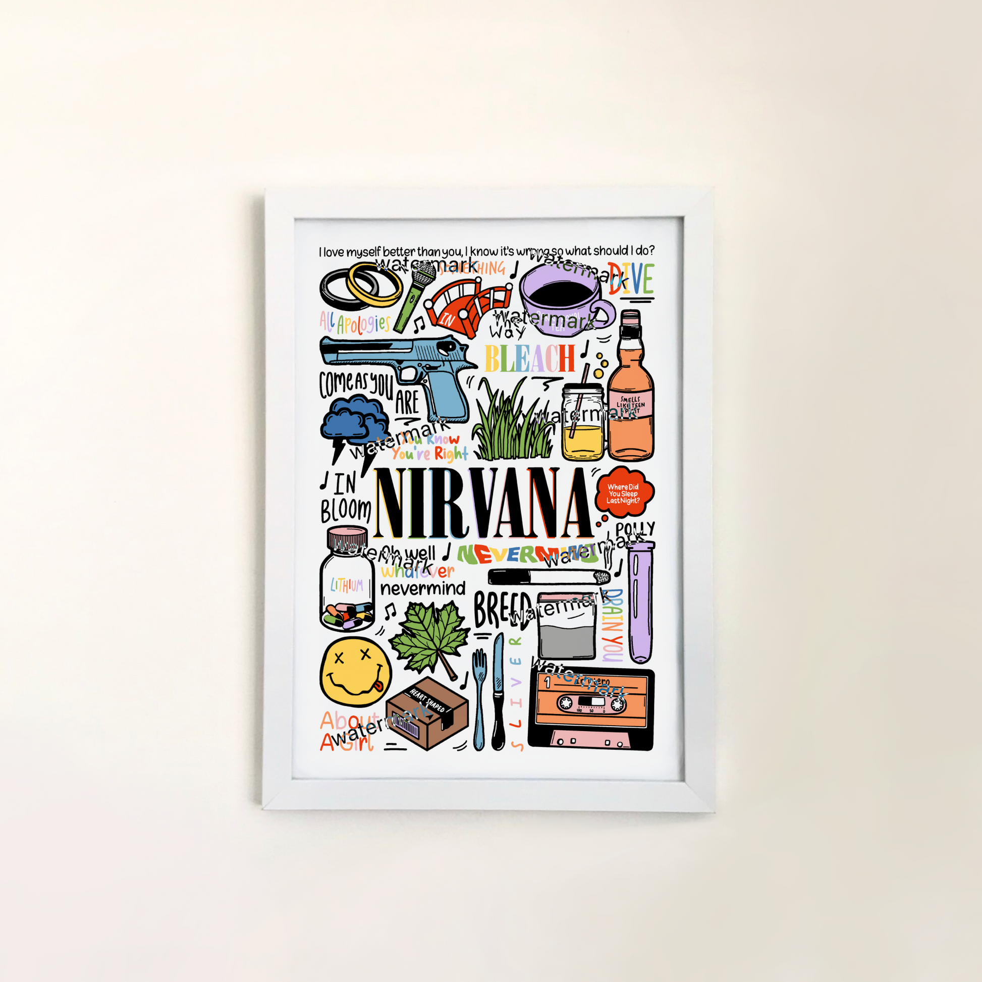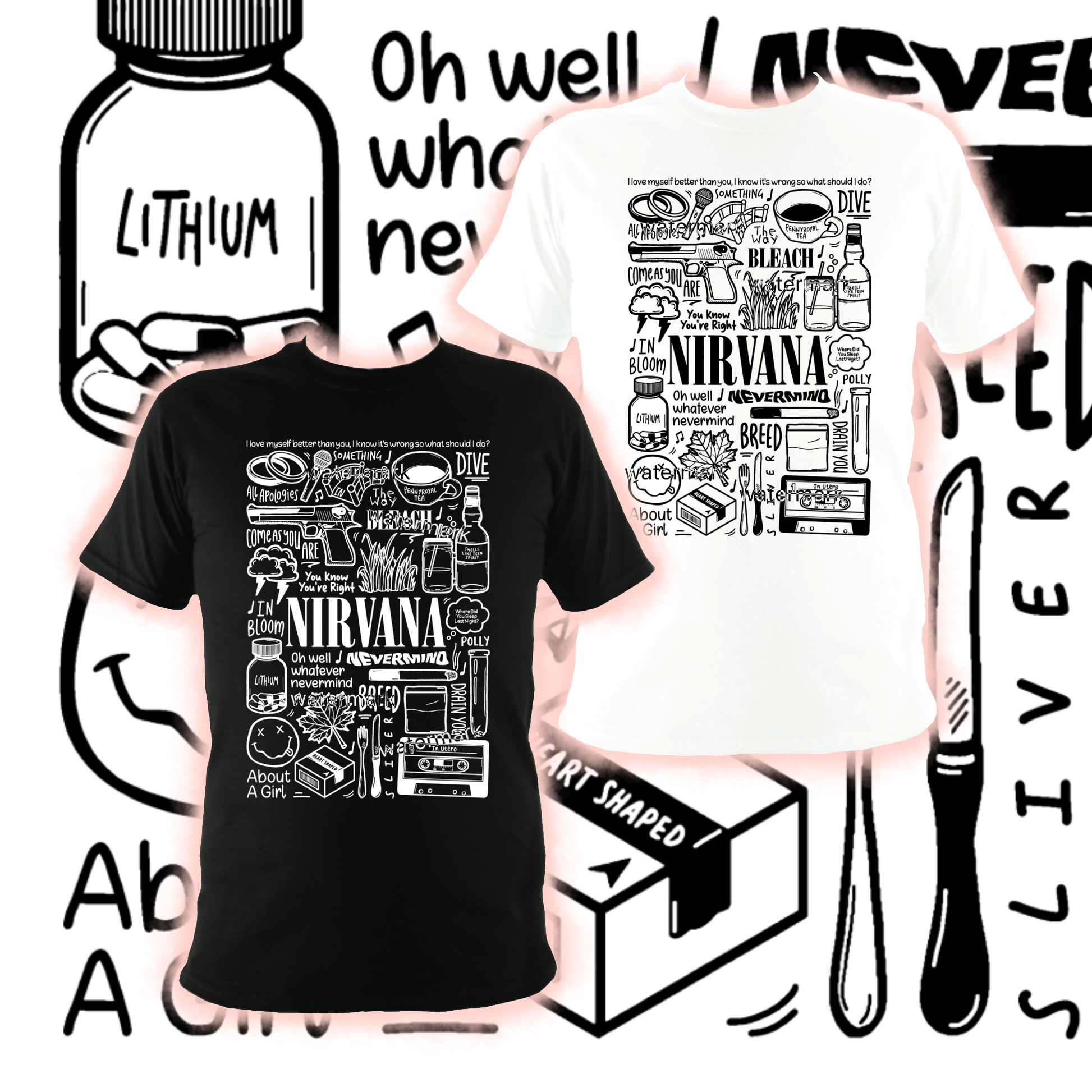 T-shirt unisexe Nirvana en coton imprimé professionnellement en noir ou blanc.