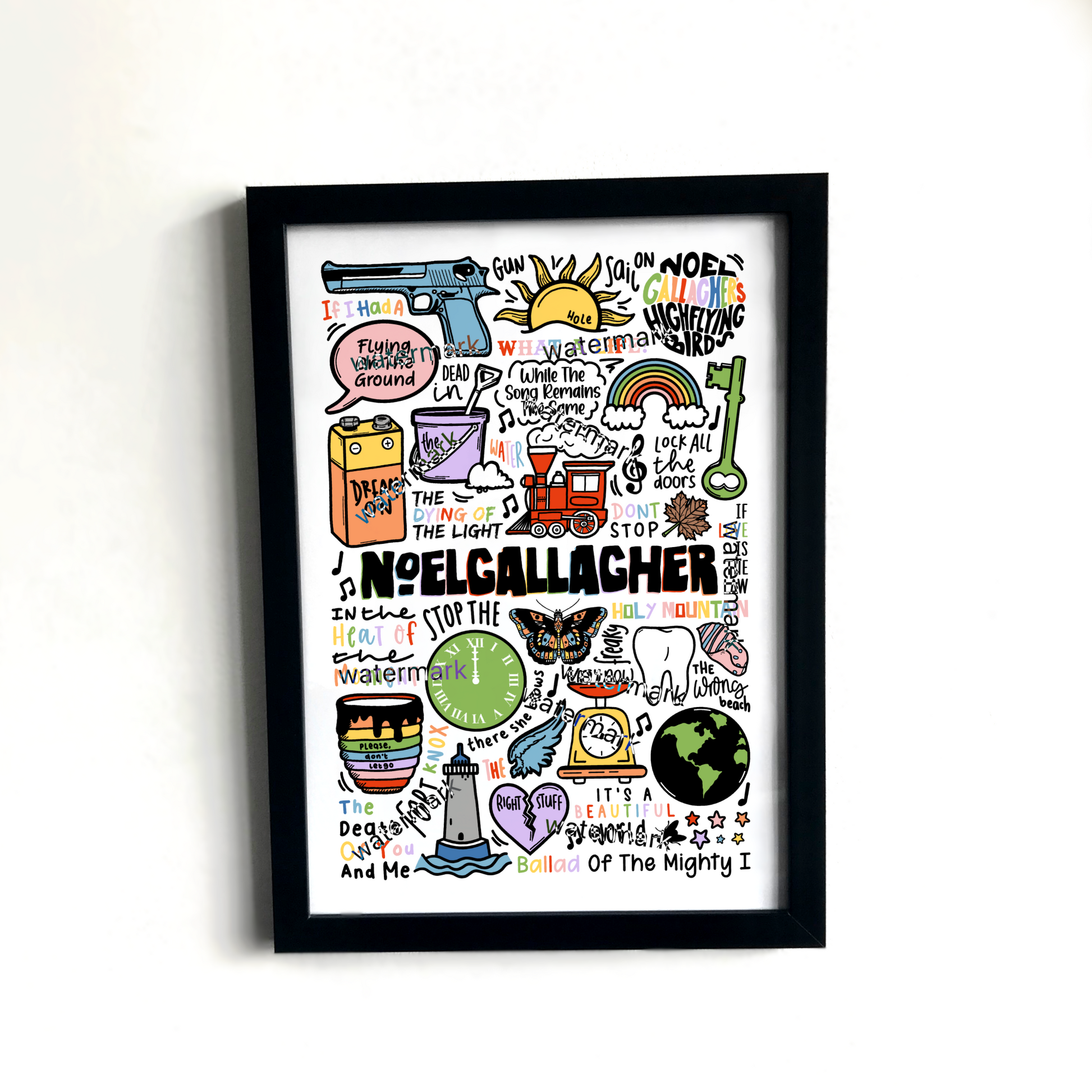 🎶Noel Gallagher wall art including images, lyrics, and song titles from his albums.