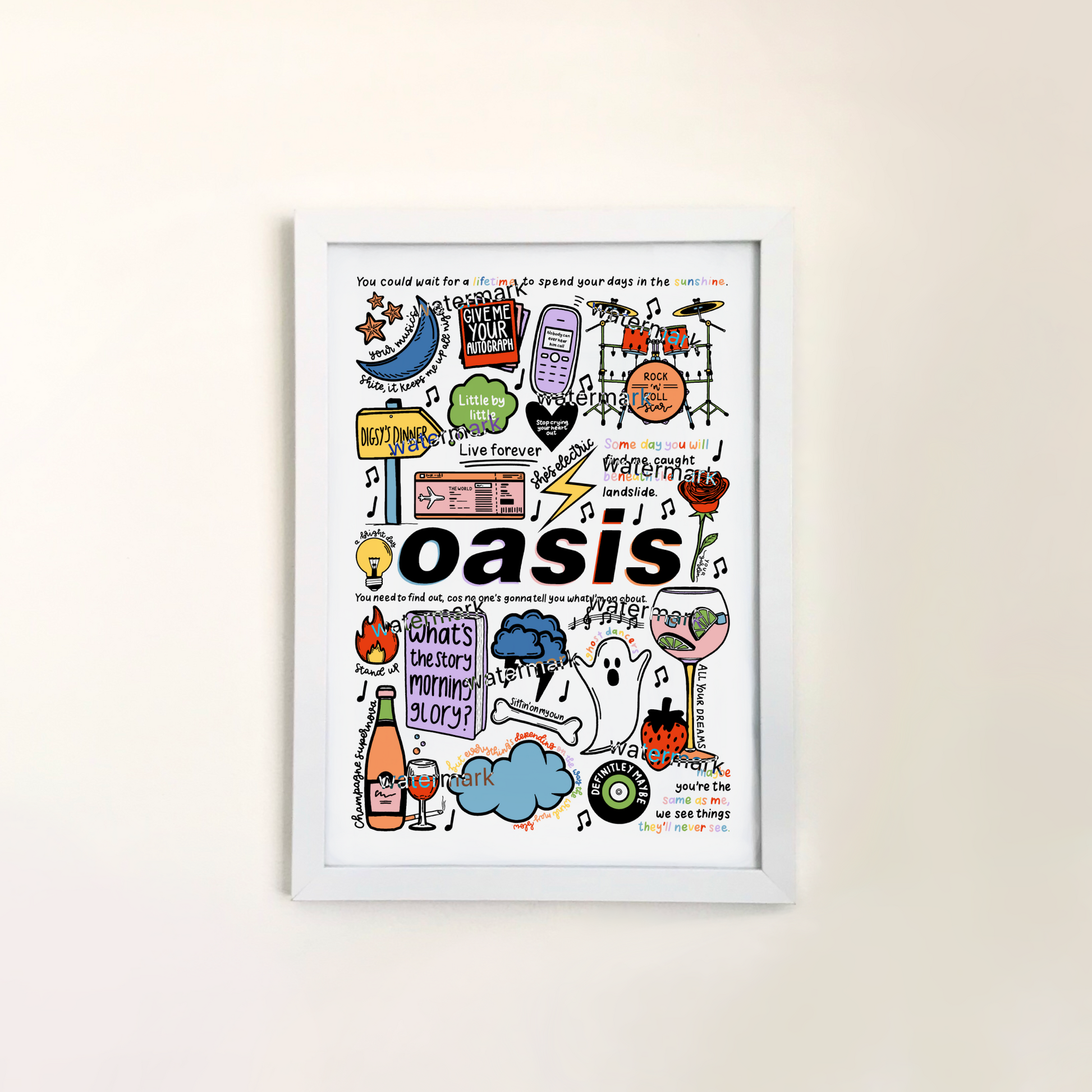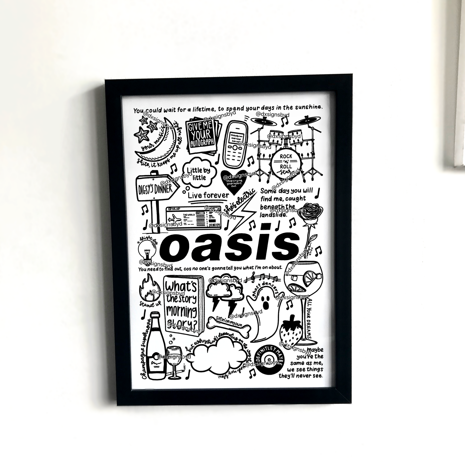 🎶Affiche Oasis avec des images et des paroles de chansons de leurs albums tels que Definitely Maybe, (What's The Story) Morning Glory ?, Be Here Now, ainsi que certaines de leurs chansons telles que Wonderwall, Don't Look Back In Anger, Champagne Supernova, Live Forever, Supersonic, She's Electric, Rock N Roll Star et Little By Little.