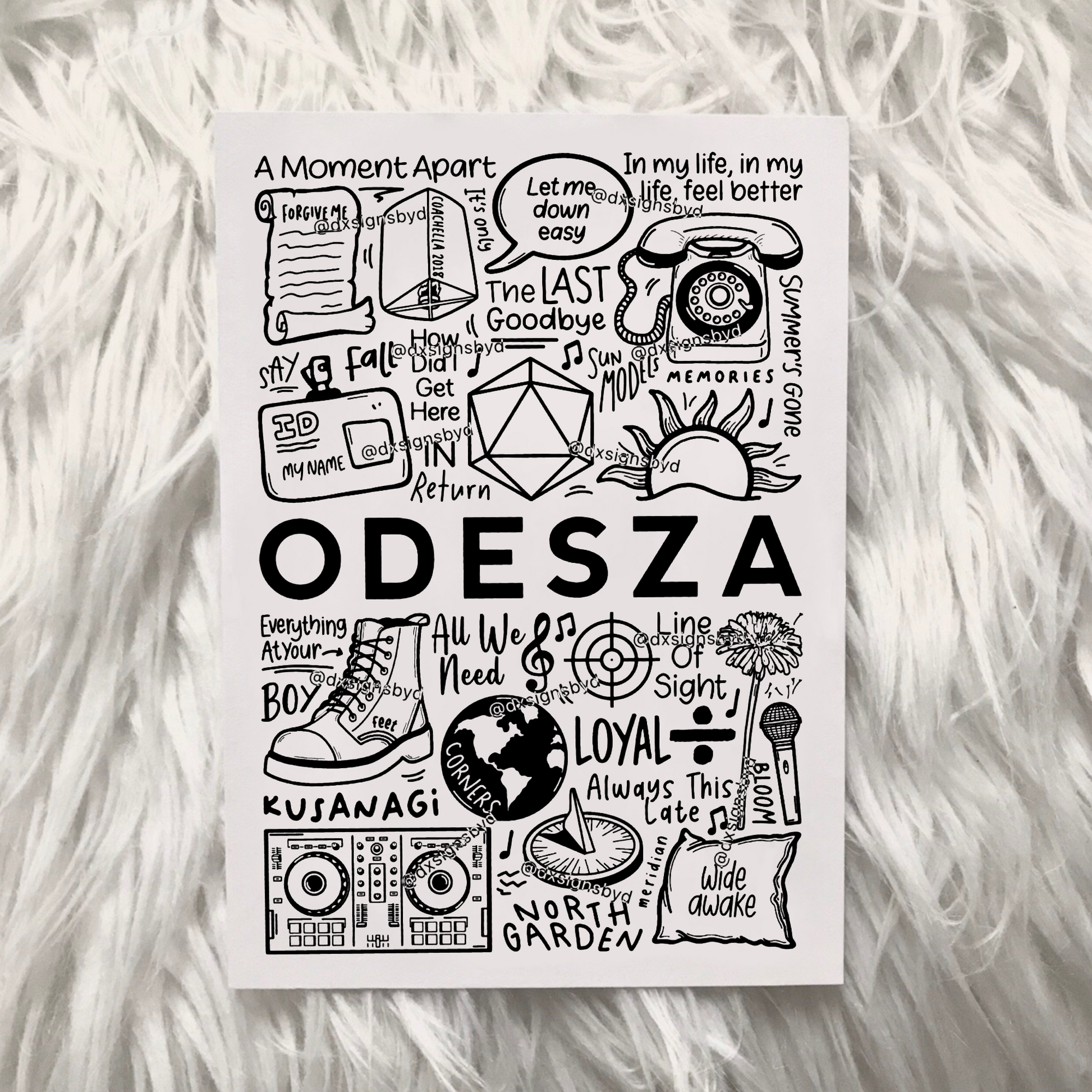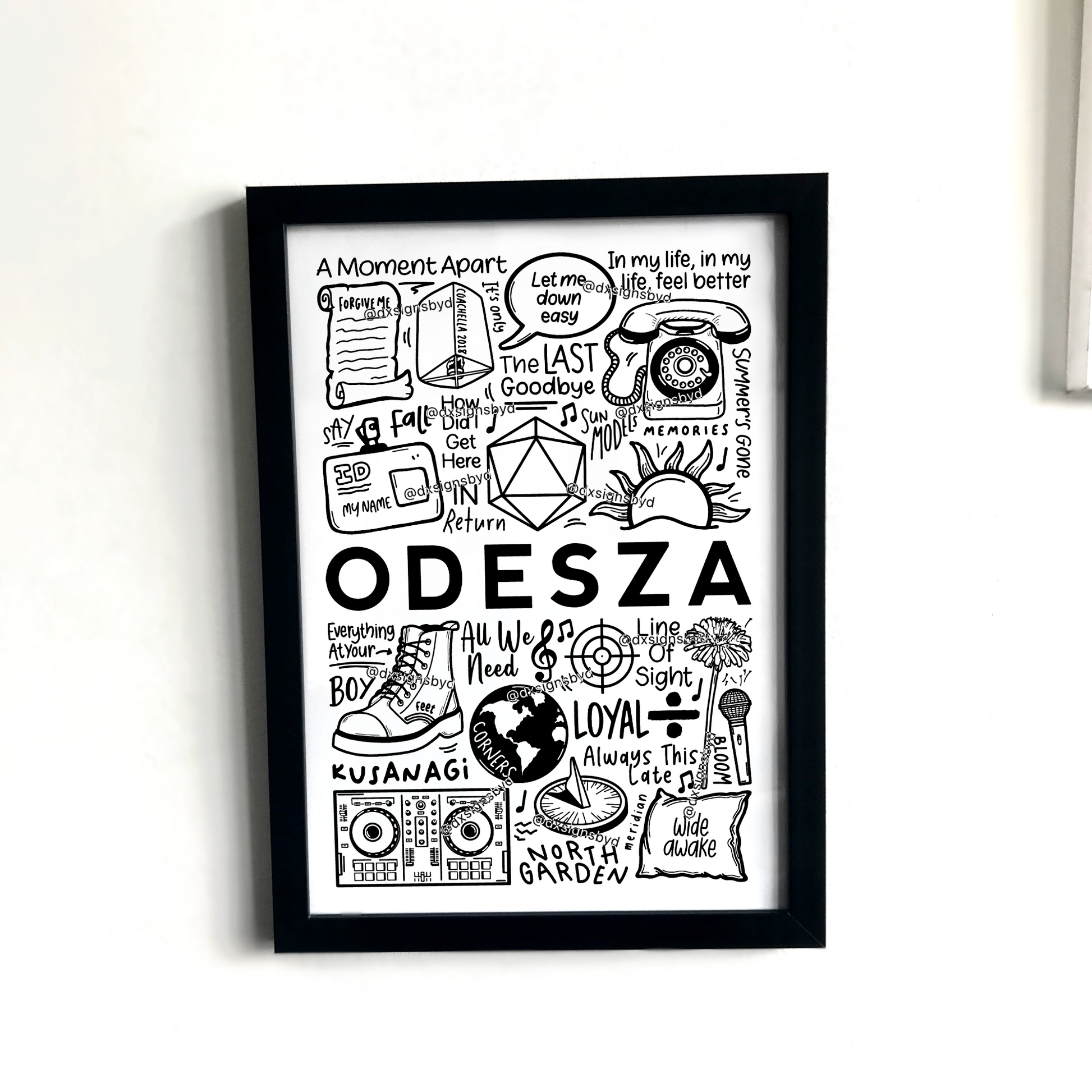 🎶Affiche imprimée d'Odesza créée à l'aide d'un iPad et d'un Apple Pencil. Elle comprend des images et des paroles de chansons de leurs albums tels que The Last Goodbye, A Moment Apart et In Return, avec des chansons telles que Meridian, Say My Name et Light Of Day.