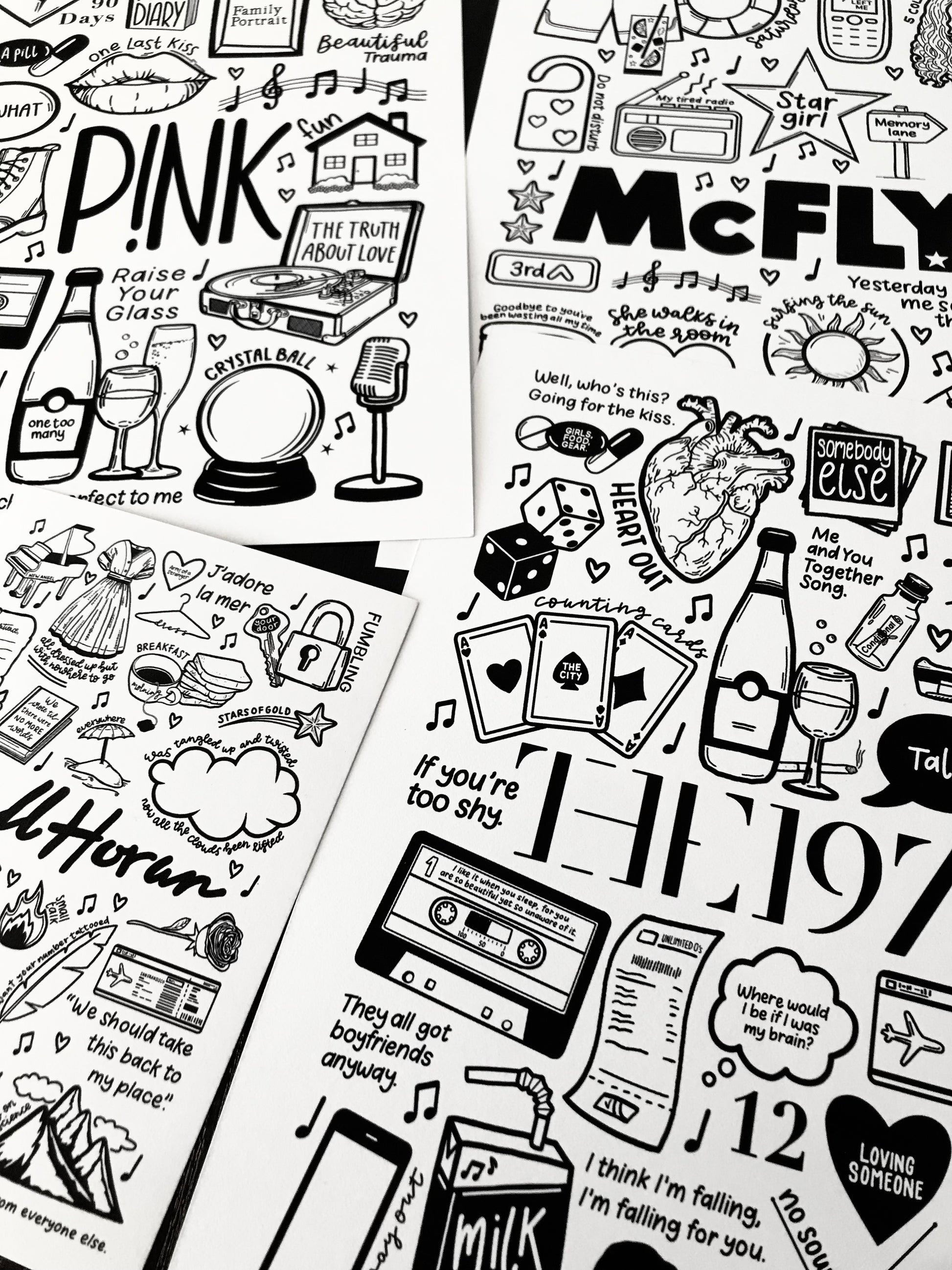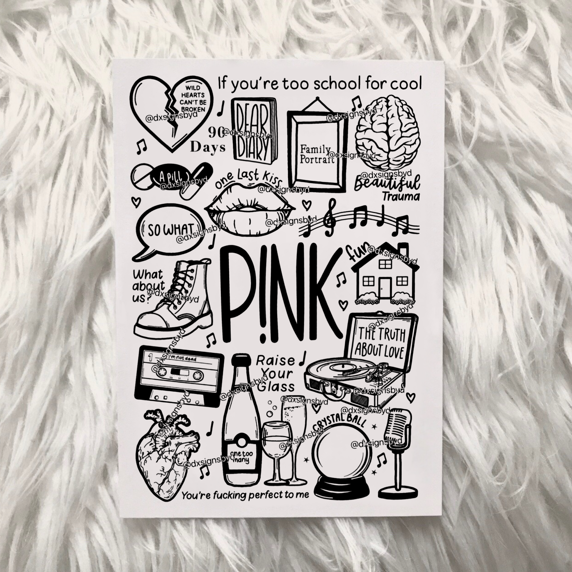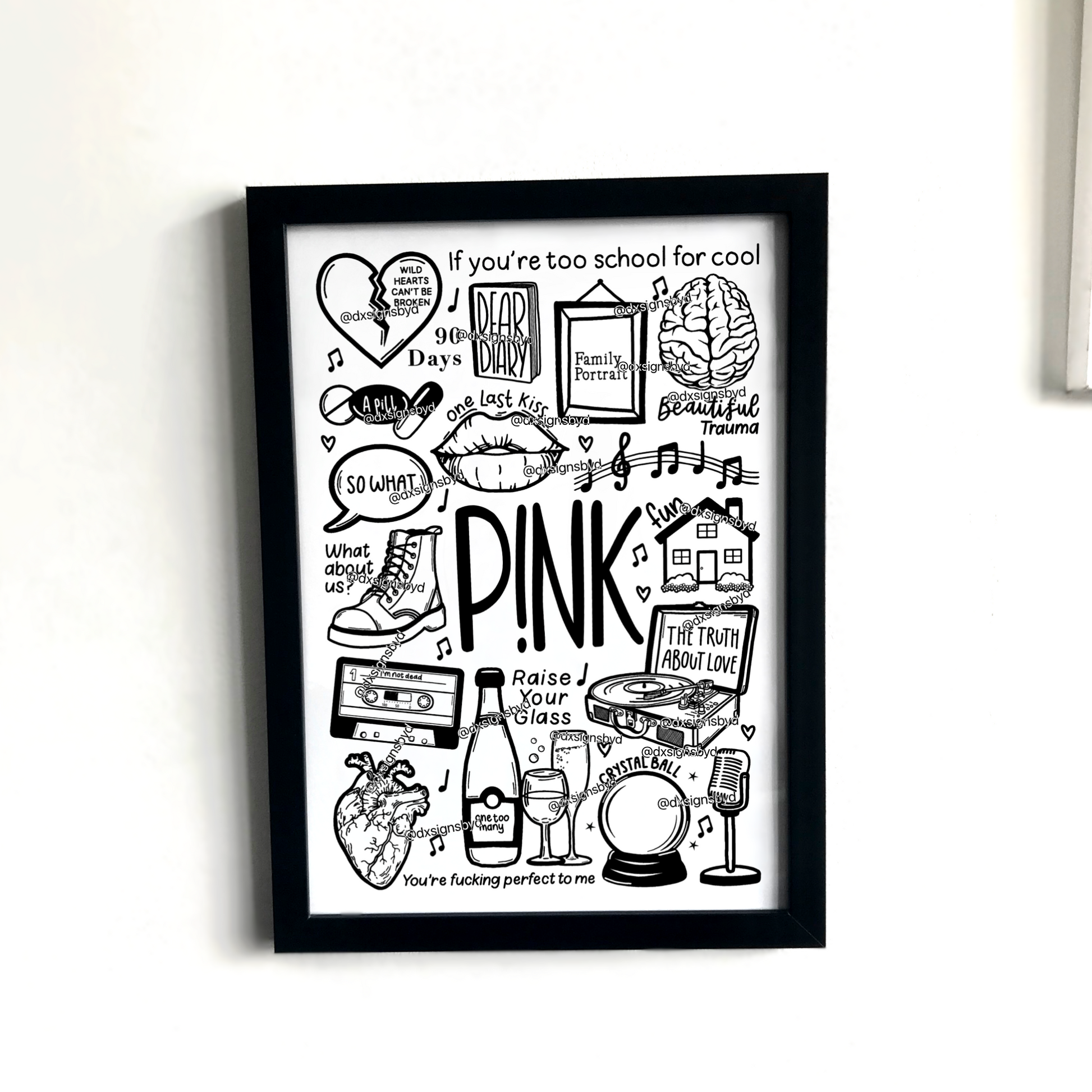 Affiche P!nk comprenant des images et des paroles de chansons de ses albums tels que Beautiful Trauma, Funhouse, The Truth About Love et Missundaztood.