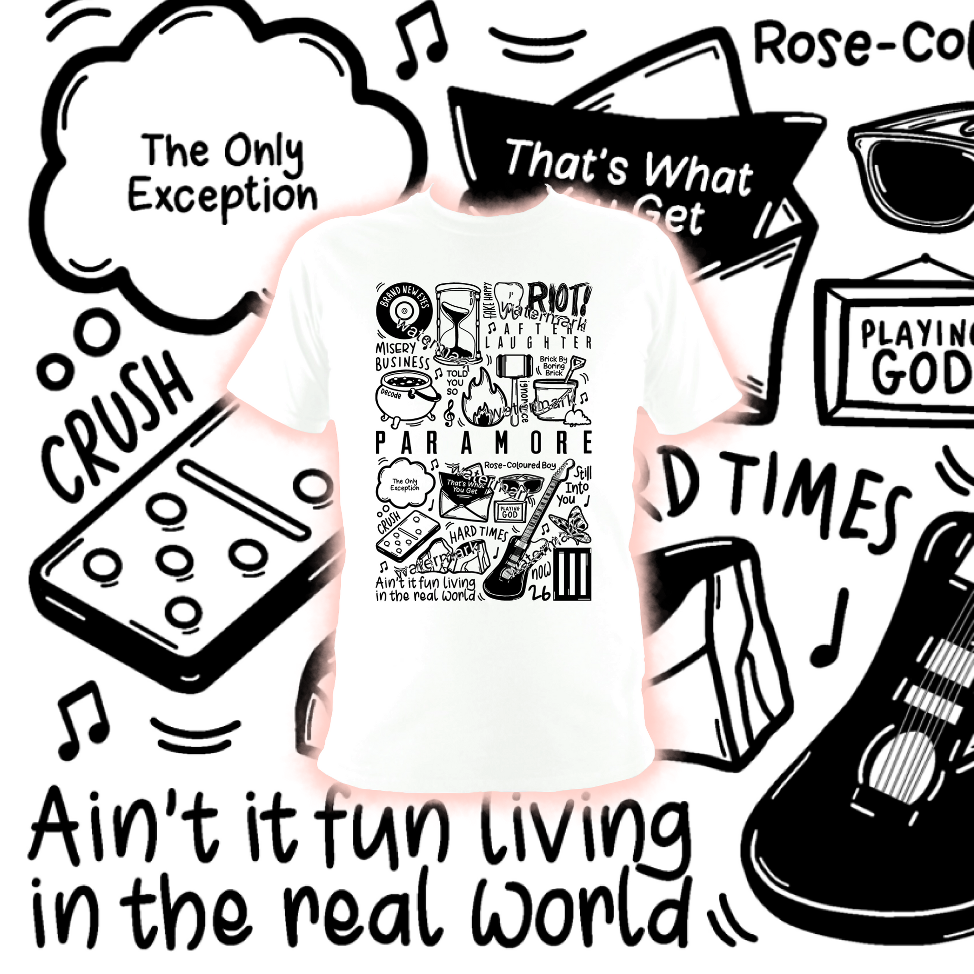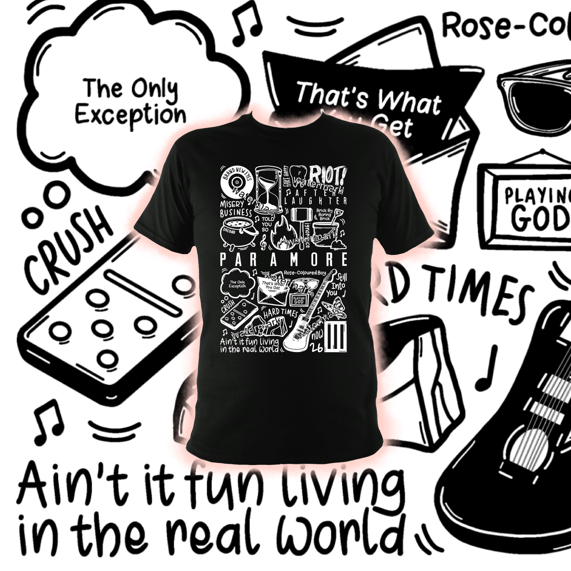 🎶 T-shirt unisexe en coton imprimé professionnellement de Paramore en noir ou blanc. Y compris leurs albums tels que Riot!, After Laughter, All We Know Is Falling et The Final Riot!