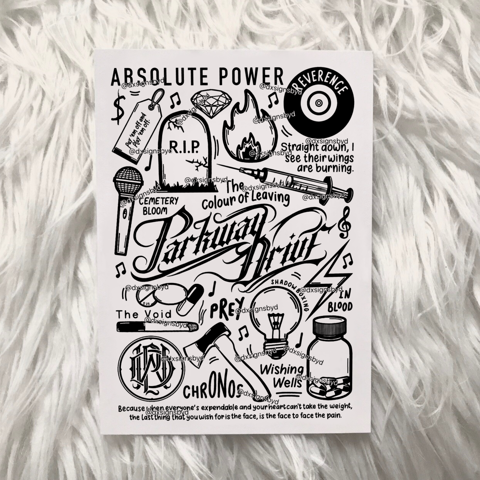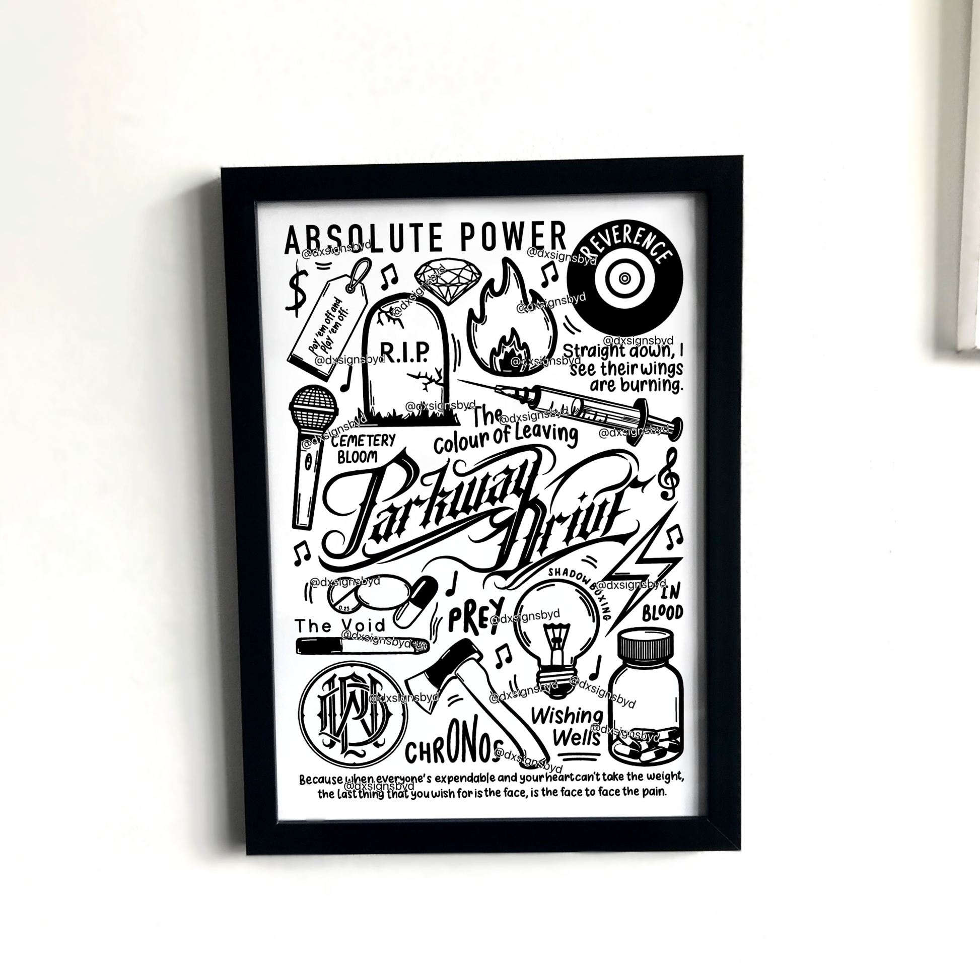 🎶Affiche imprimée de Parkway Drive créée à l'aide d'un iPad et d'un Apple Pencil. Elle comprend des images et des paroles de chansons de leur album Reverence.