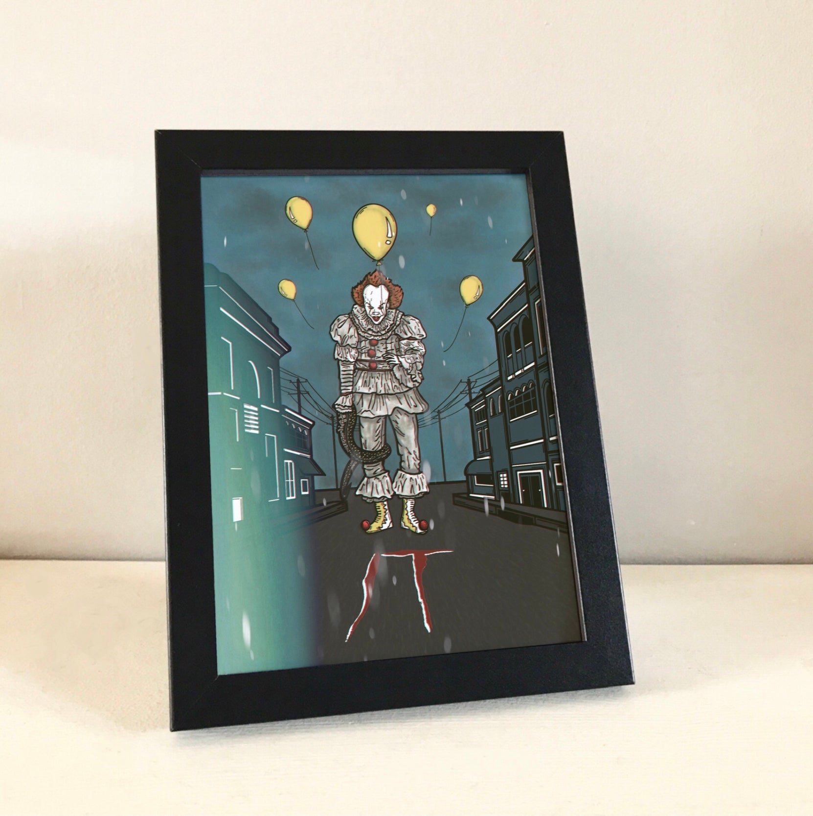 Affiche imprimée du clown IT présentant une image de Pennywise des films au milieu d'une rue, avec des ballons jaunes volant autour de lui.