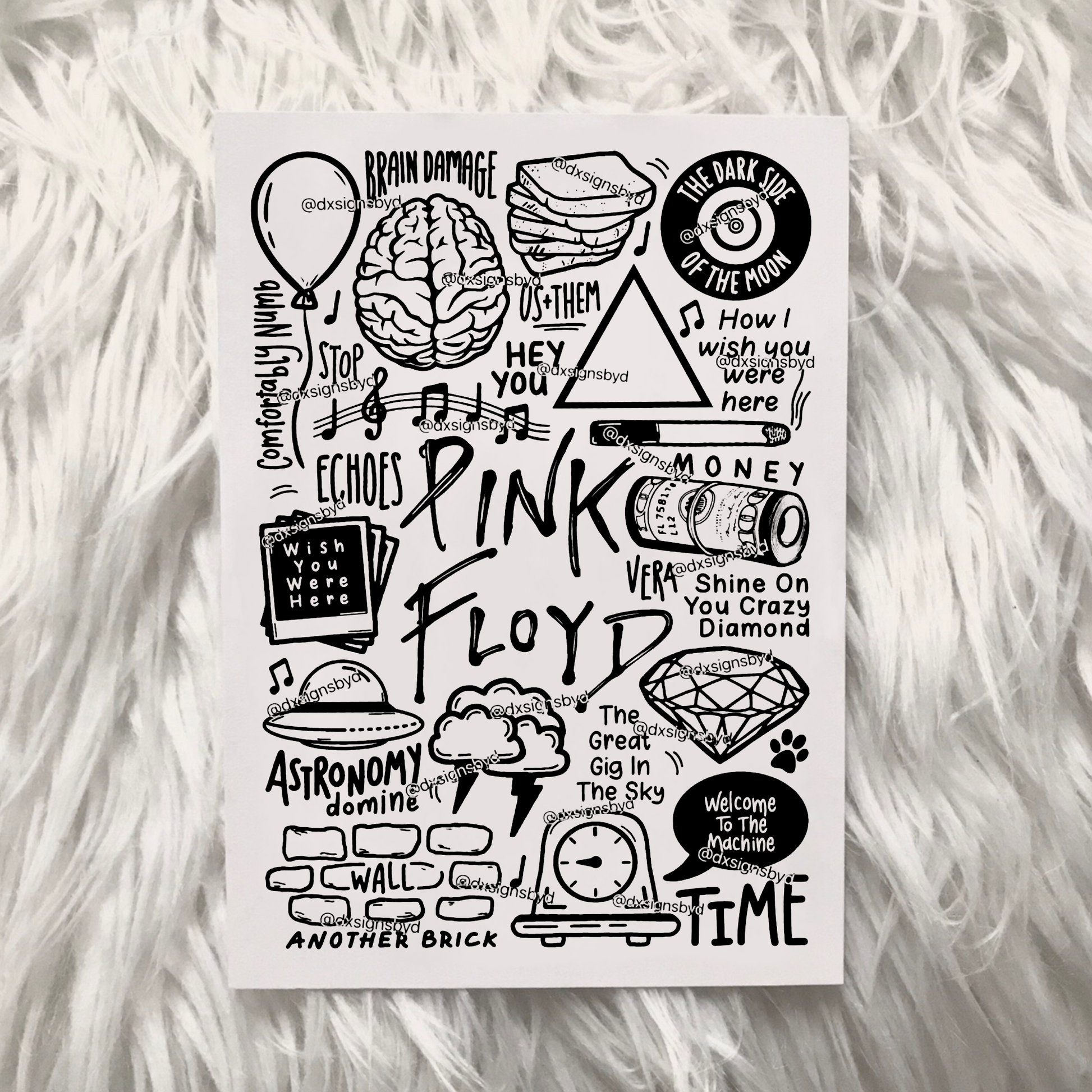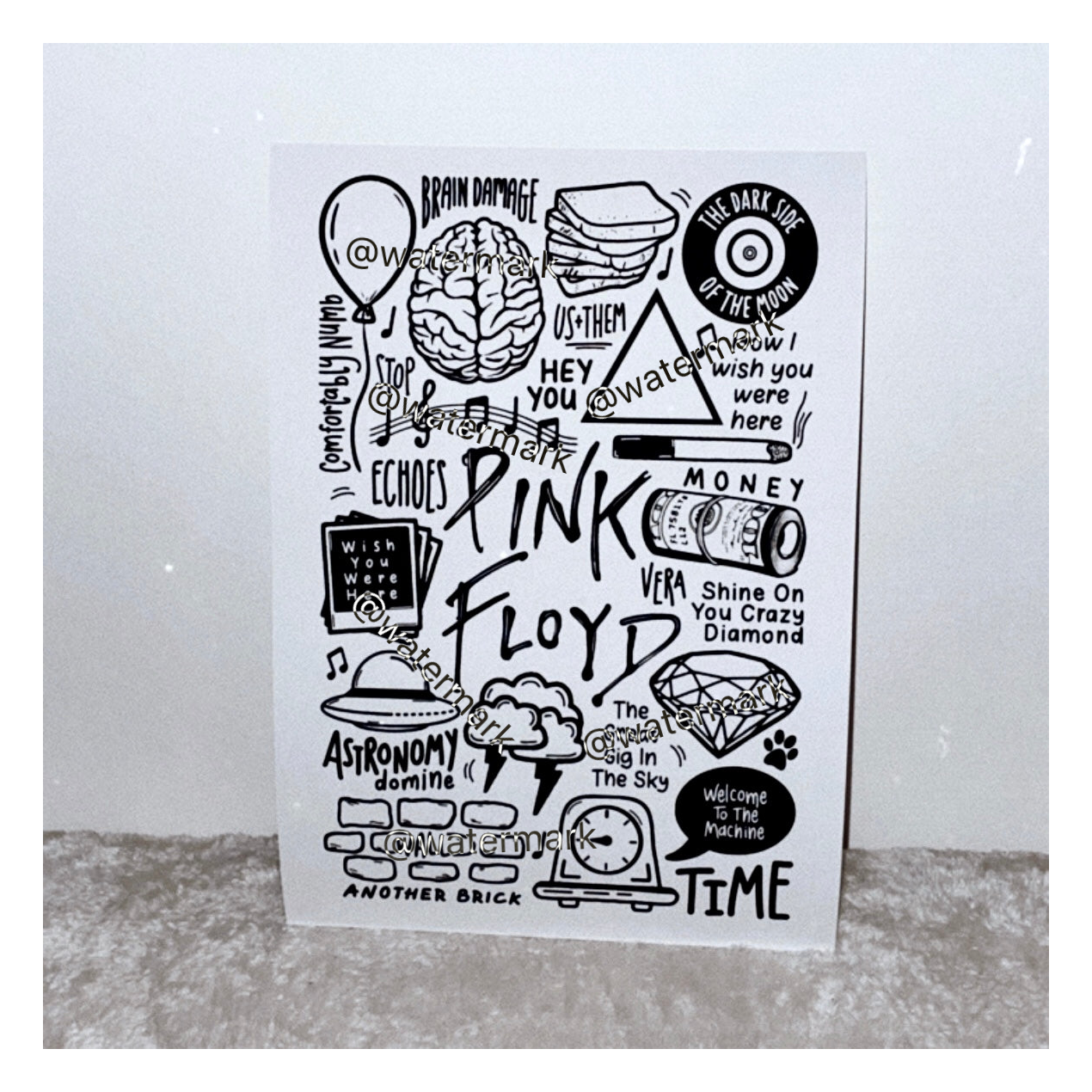 🎶Affiche de Pink Floyd qui comprend des images et des paroles de chansons de leurs albums tels que