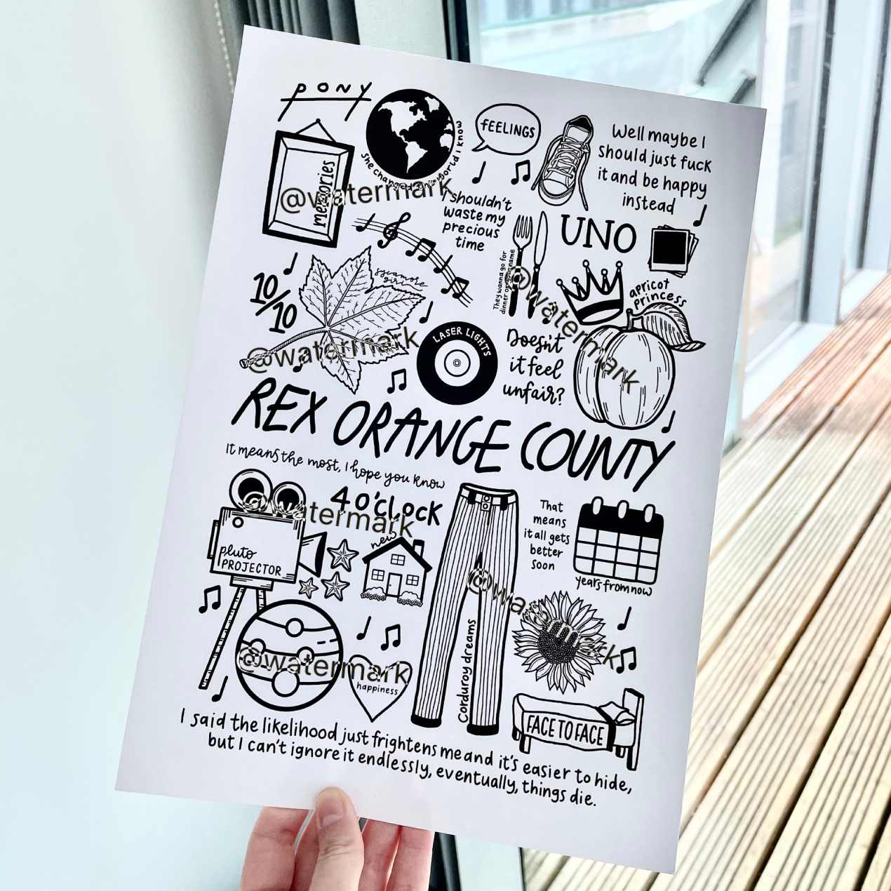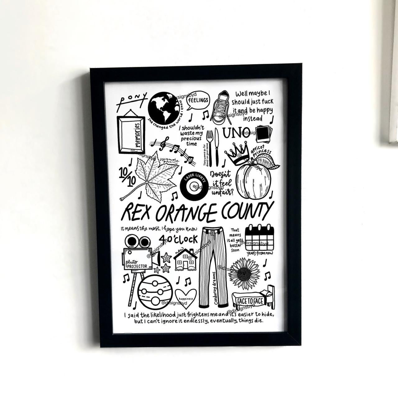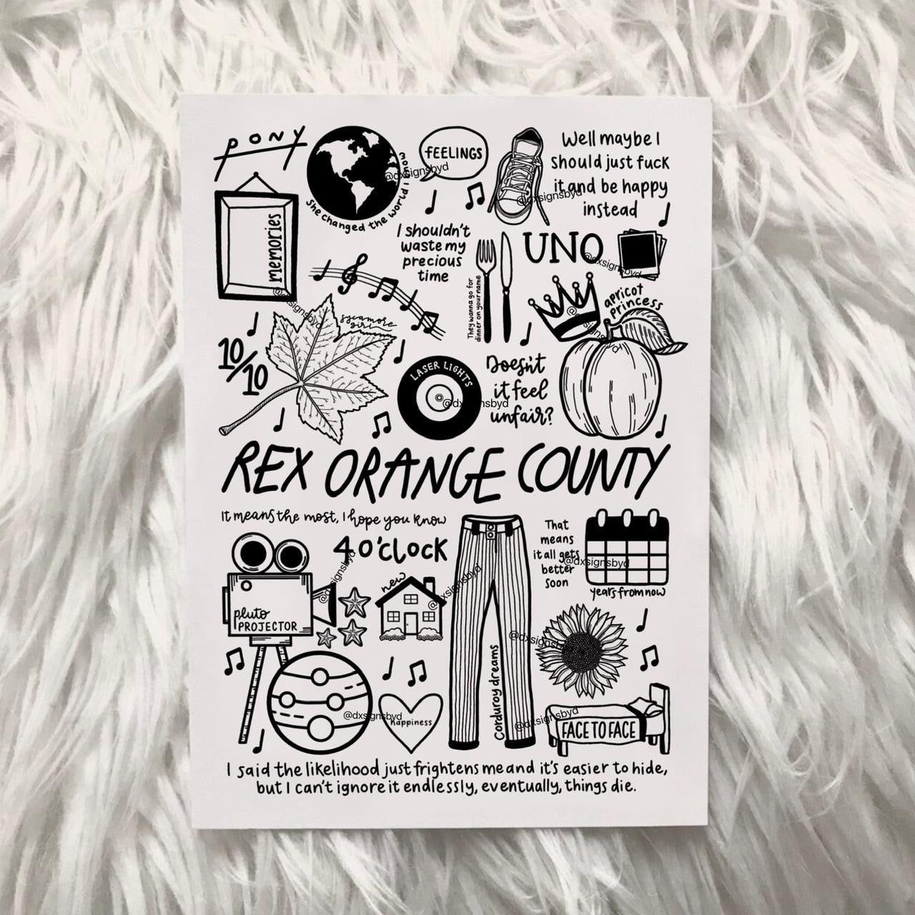 🎶Affiche de Rex Orange County qui comprend des images et des paroles de chansons de leurs albums tels que Bcos U Will Never B Free, Apricot Princess et Pony.