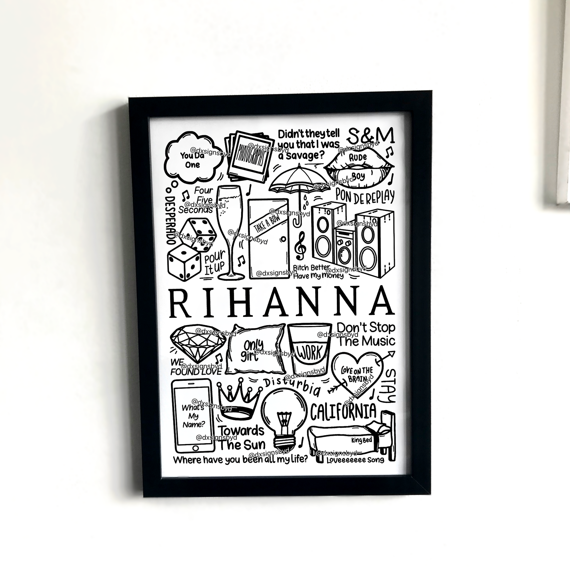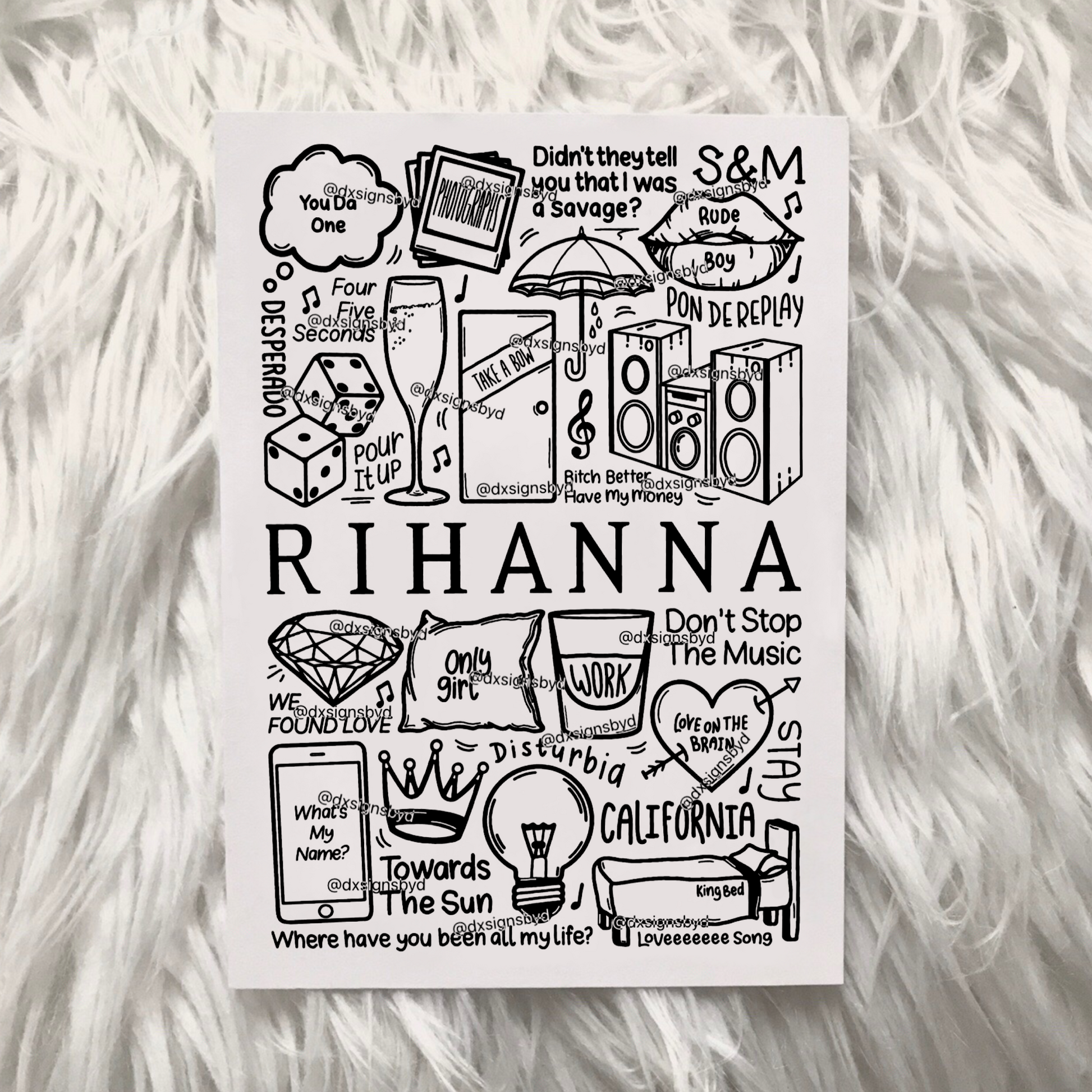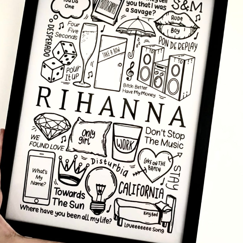 🎶Affiche de Rihanna créée à l'aide d'un iPad et d'un Apple Pencil. Elle comprend des images et des paroles de chansons de leurs albums tels que Anti, Loud, Good Girl Gone Bad, Unapologetic, Talk That Talk, ainsi que ses chansons telles que Umbrella, Diamonds, We Found Love, Only Girl, Take A Bow, Rude Boy et Don't Stop The Music.