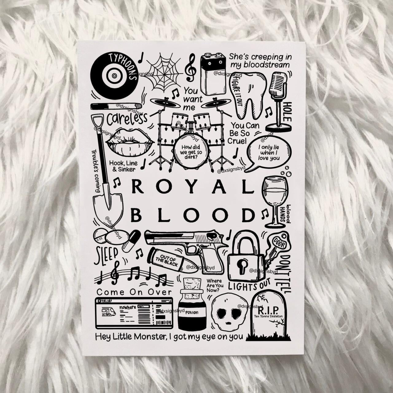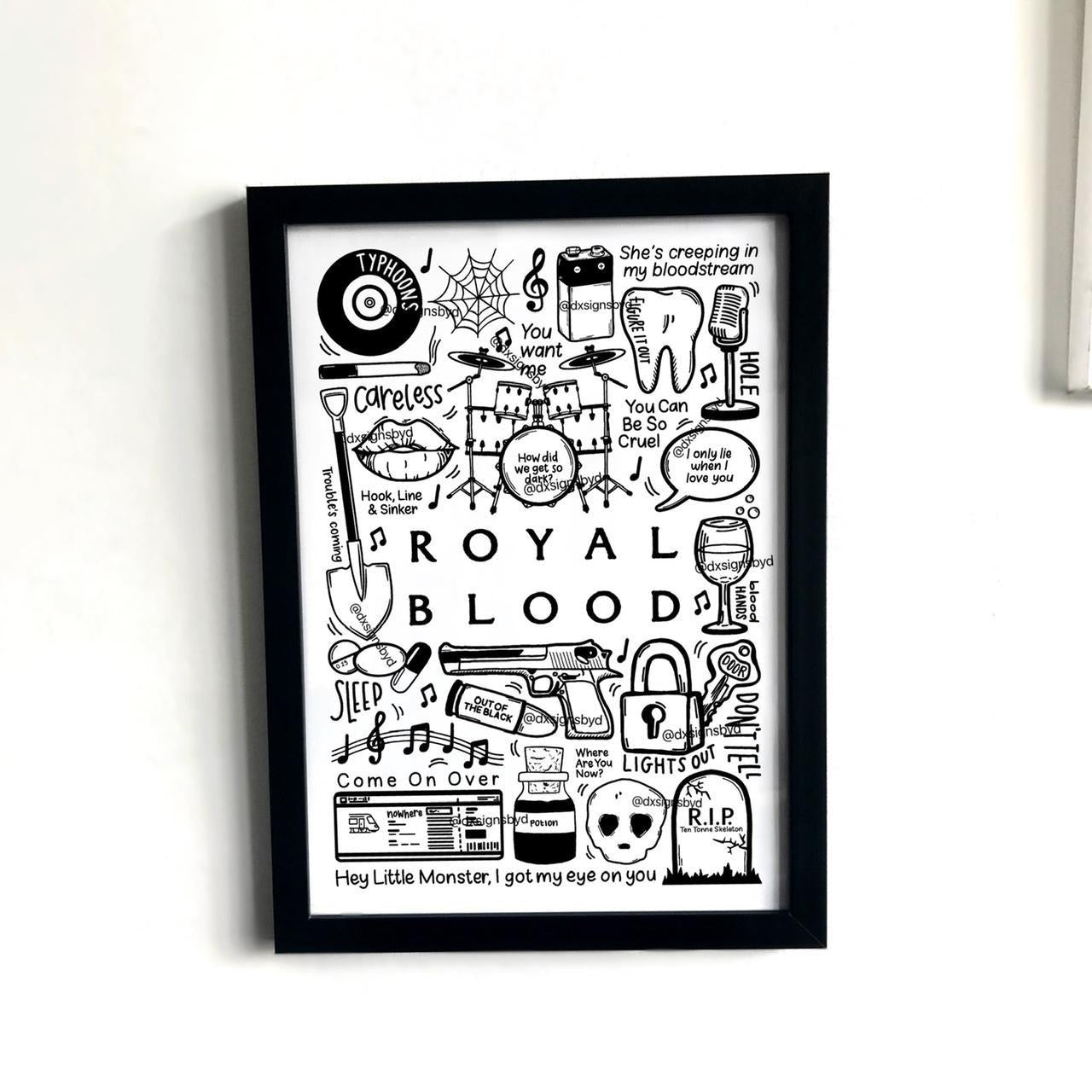 🎶Affiche Royal Blood comprenant des images et des paroles de chansons de leurs albums tels que Typhoons, How Did We Get So Dark ? et Royal Blood.