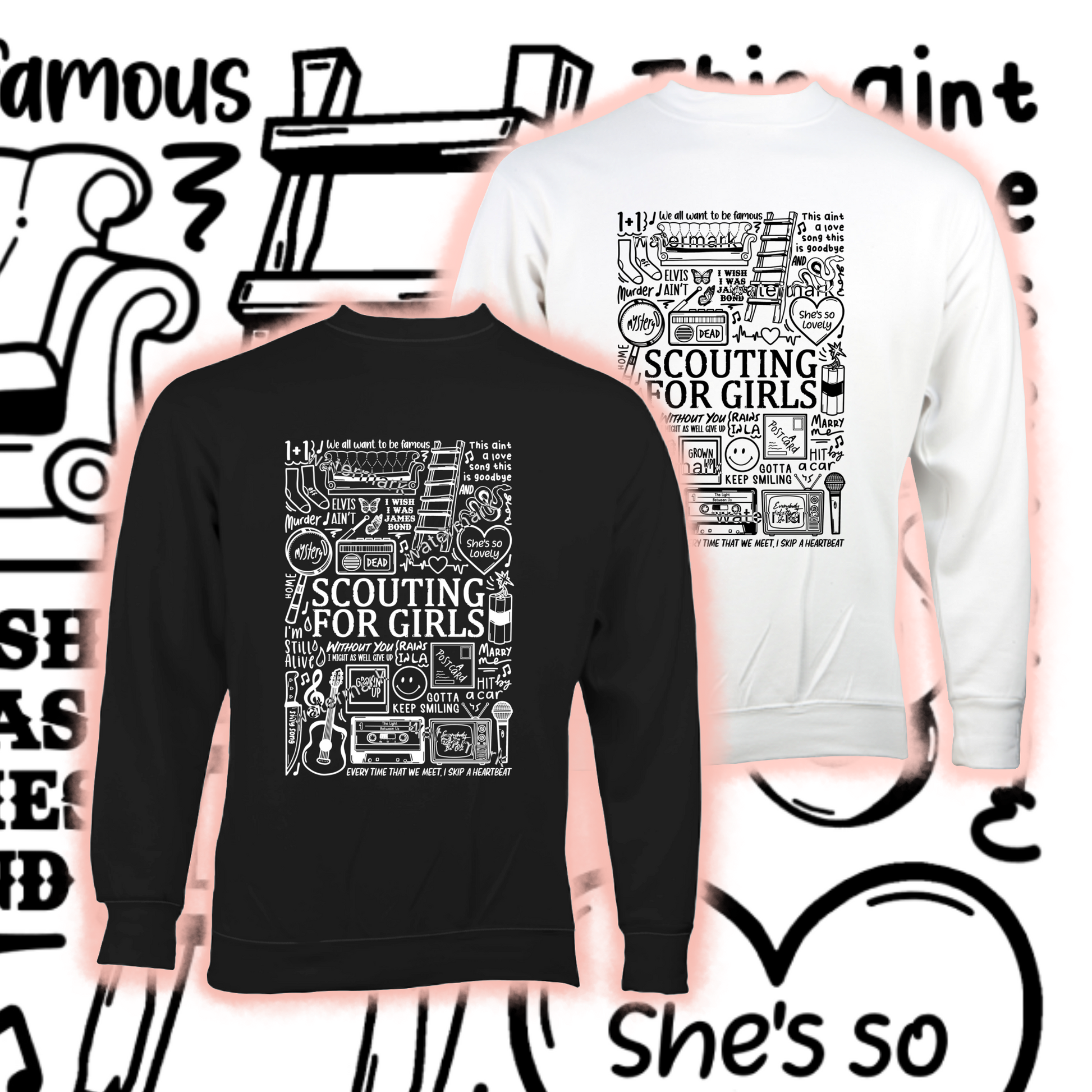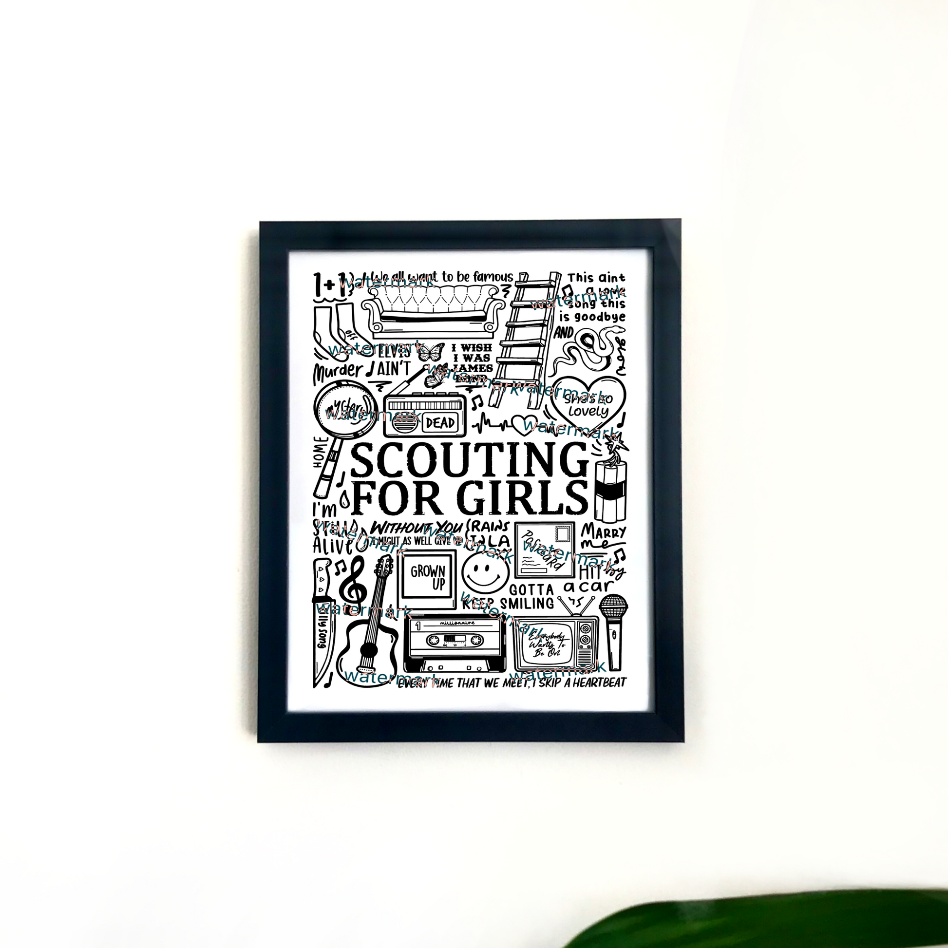 🎶 Art mural Scouting For Girls comprenant des images, des paroles et des titres de chansons de leurs albums.