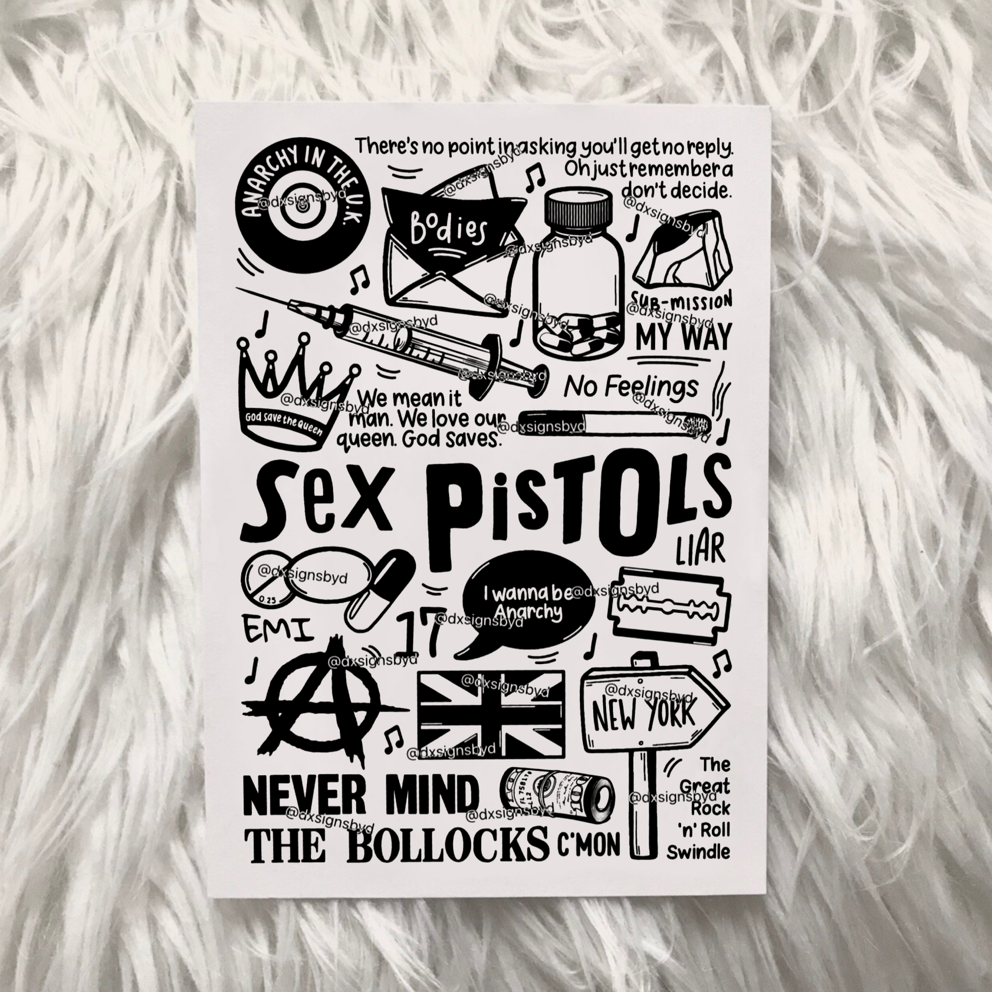 🎶Affiche des Sex Pistols créée à l'aide d'un iPad et d'un Apple Pencil. Elle comprend des images et des paroles de chansons de leurs albums tels que Spunk et Never Mind The Bollocks.
