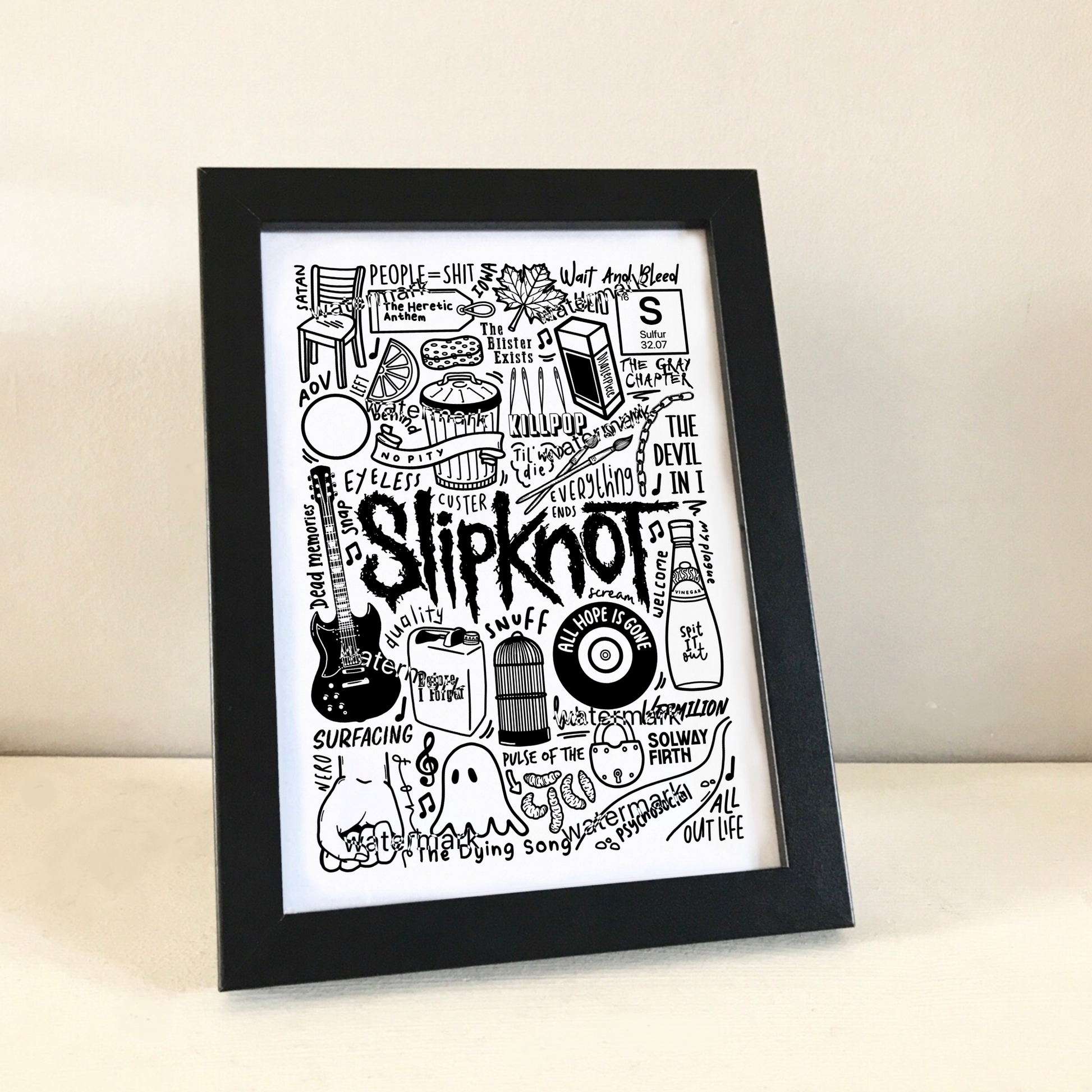 🎶Slipknot wall art including images, lyrics, and song titles from their albums.
