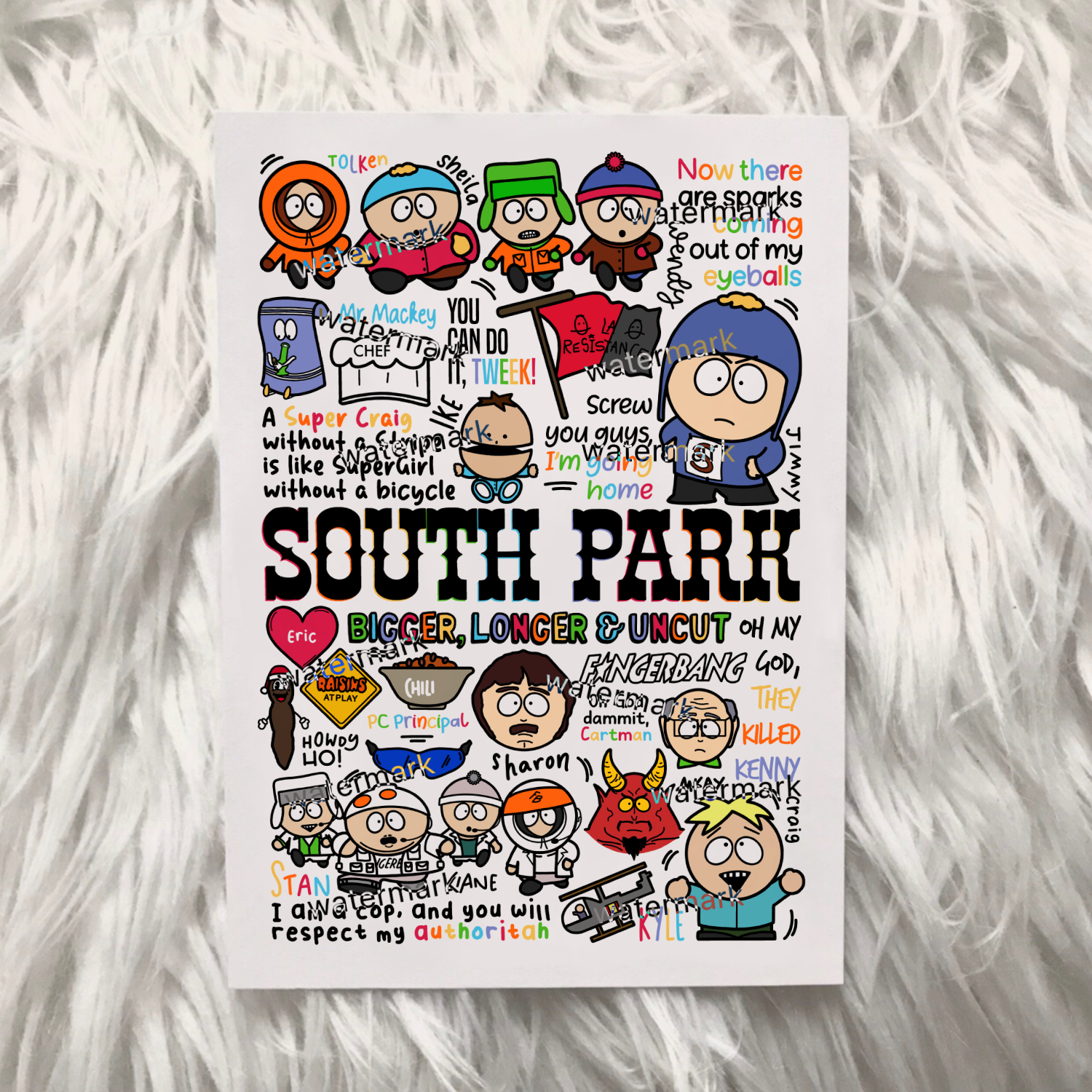 🎬T-shirt unisexe South Park en coton imprimé professionnellement en noir ou blanc.