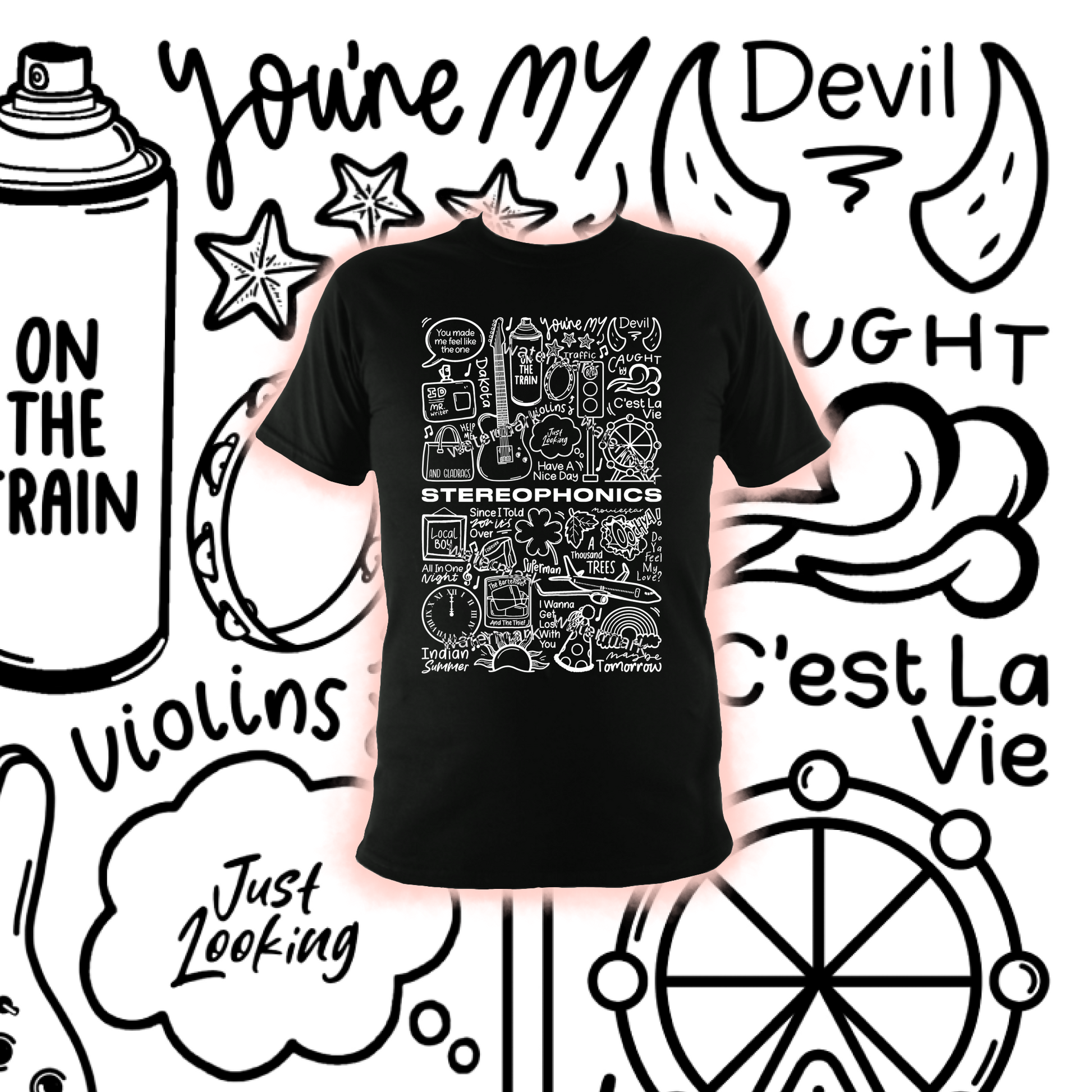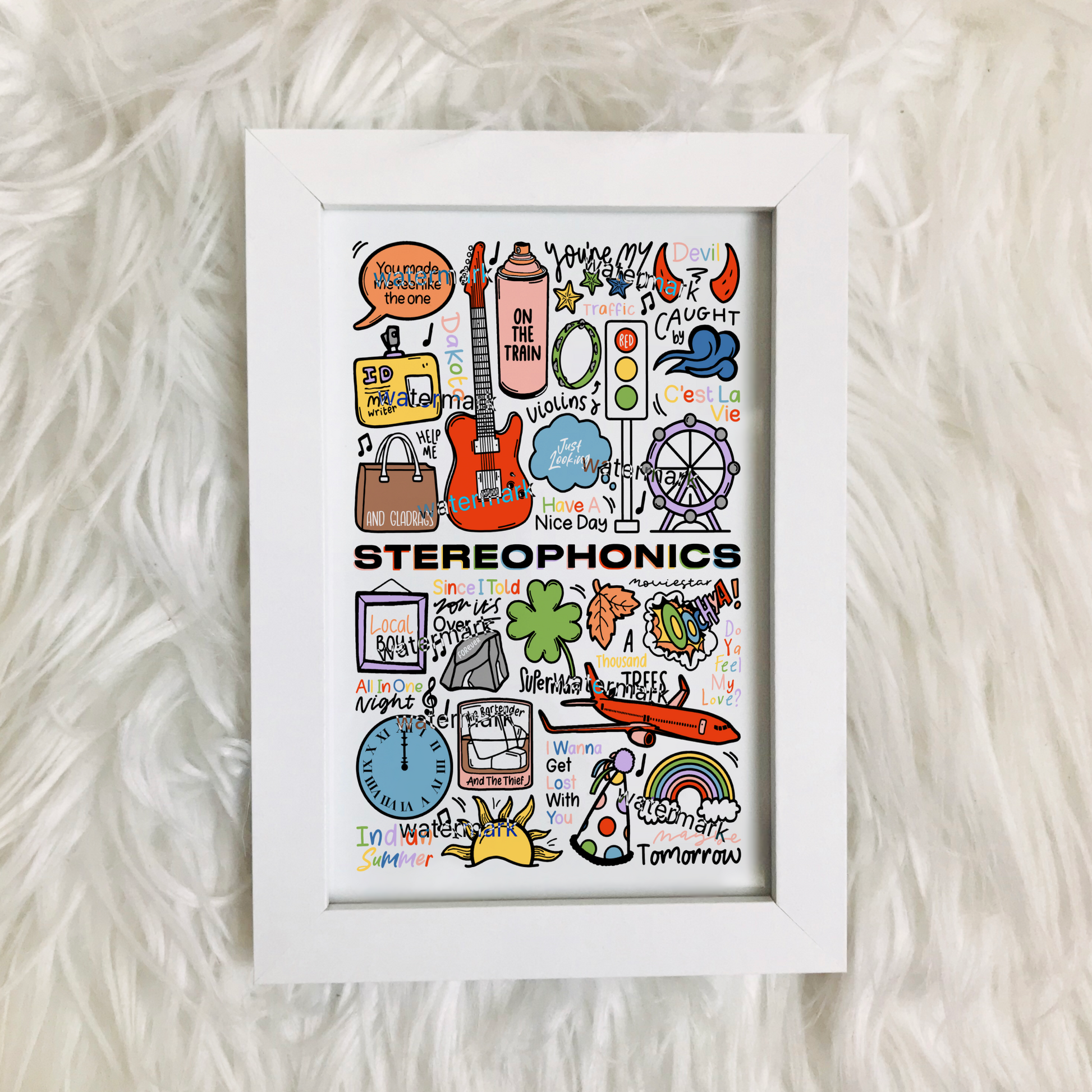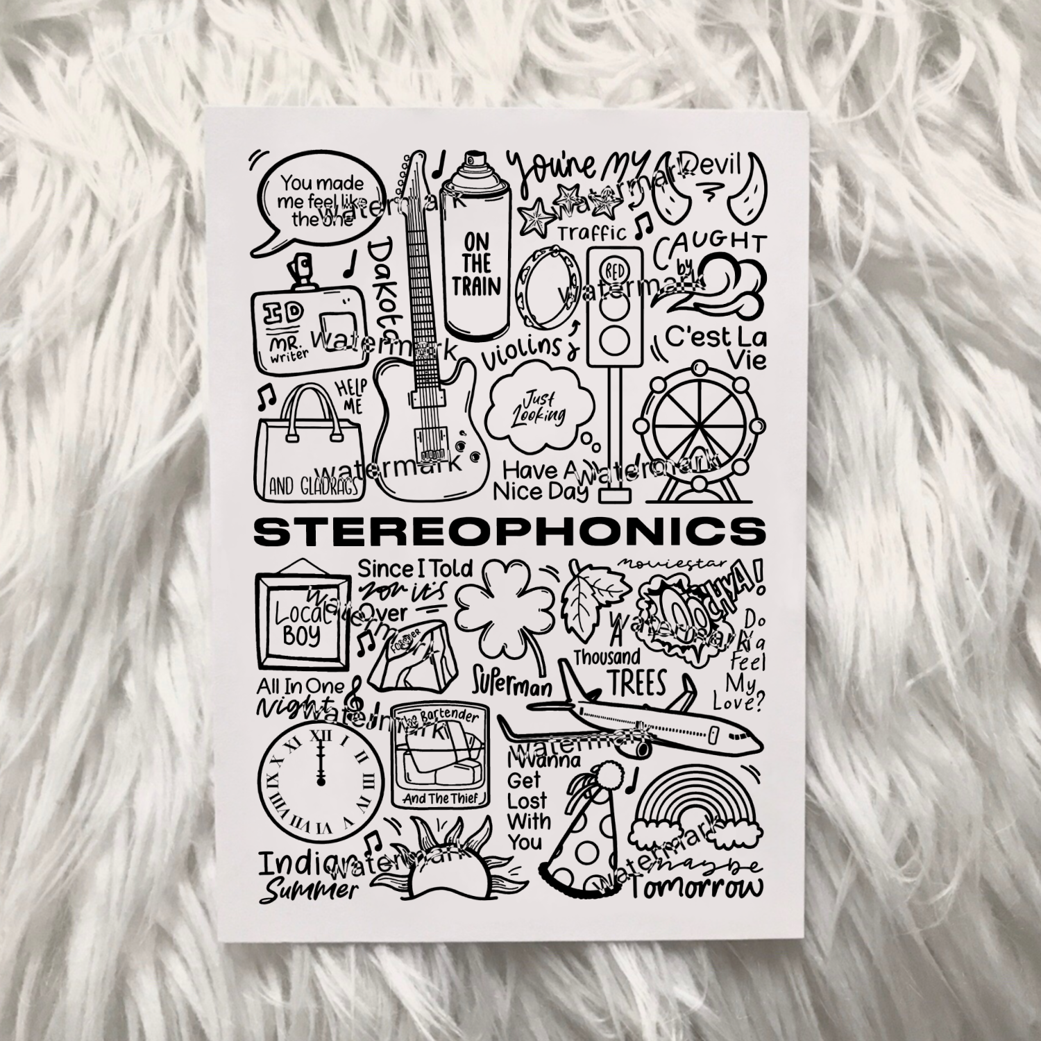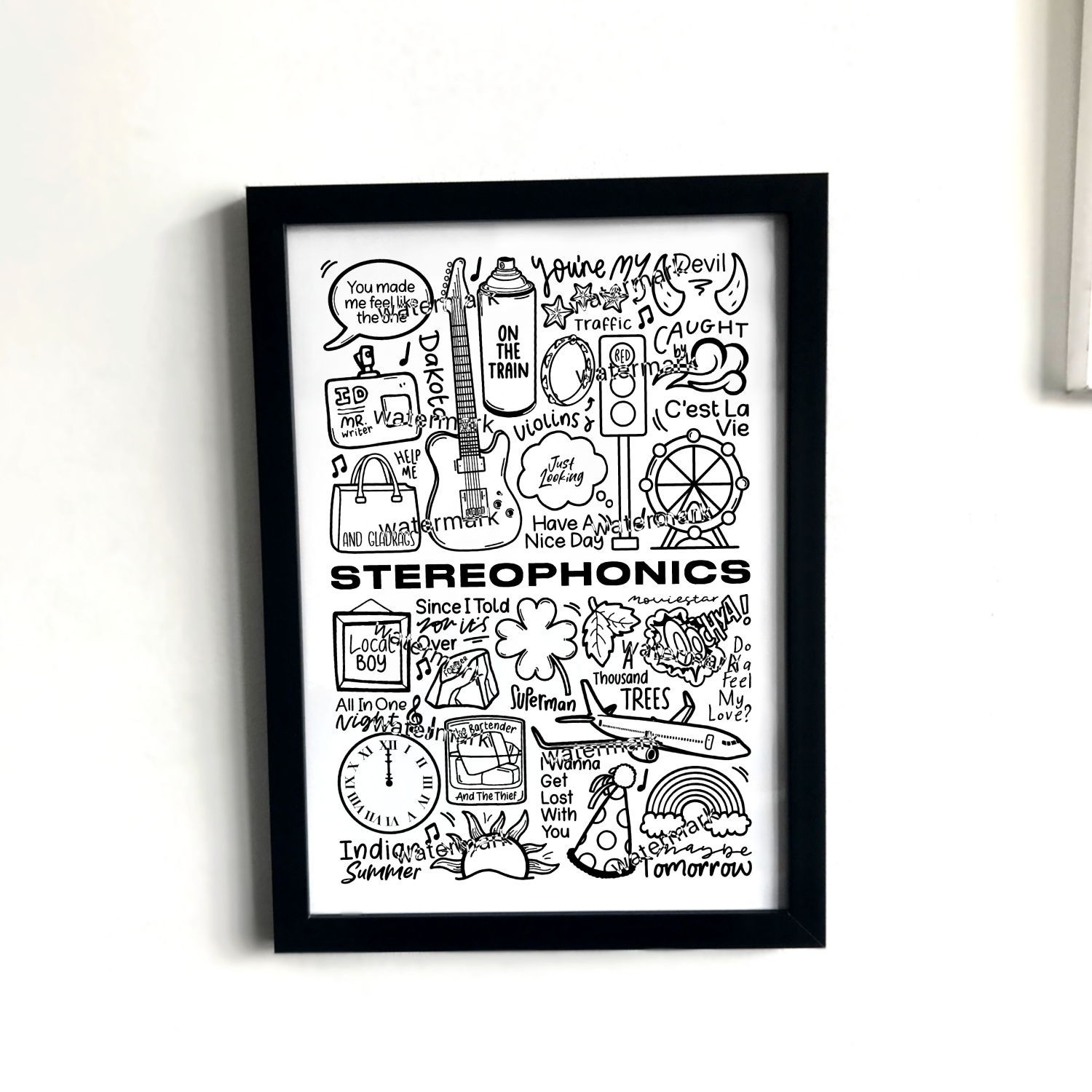 🎶 Affiche imprimée de Stereophonics créée à l'aide d'un iPad et d'un Apple Pencil. Elle comprend des images et des paroles de chansons de leurs albums.