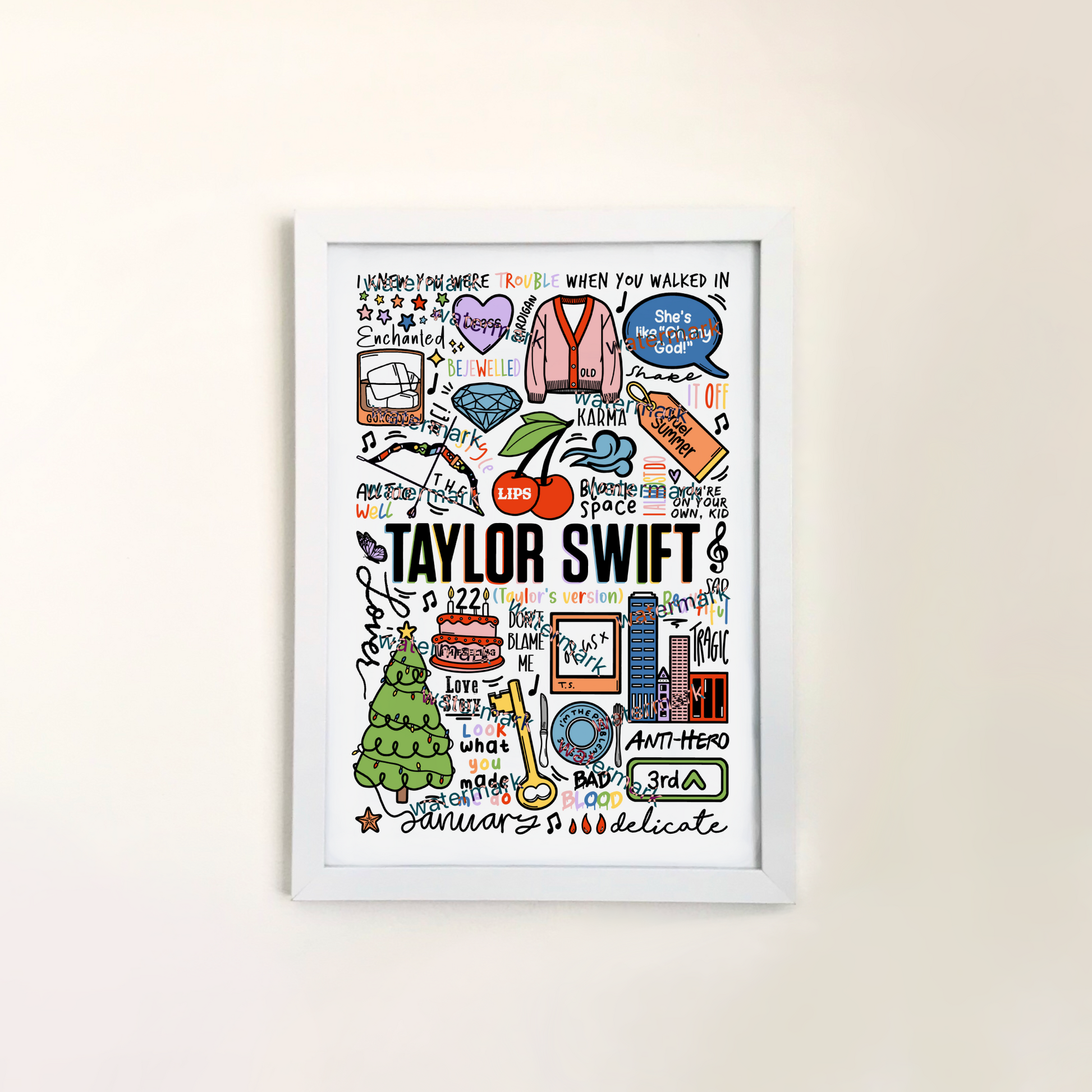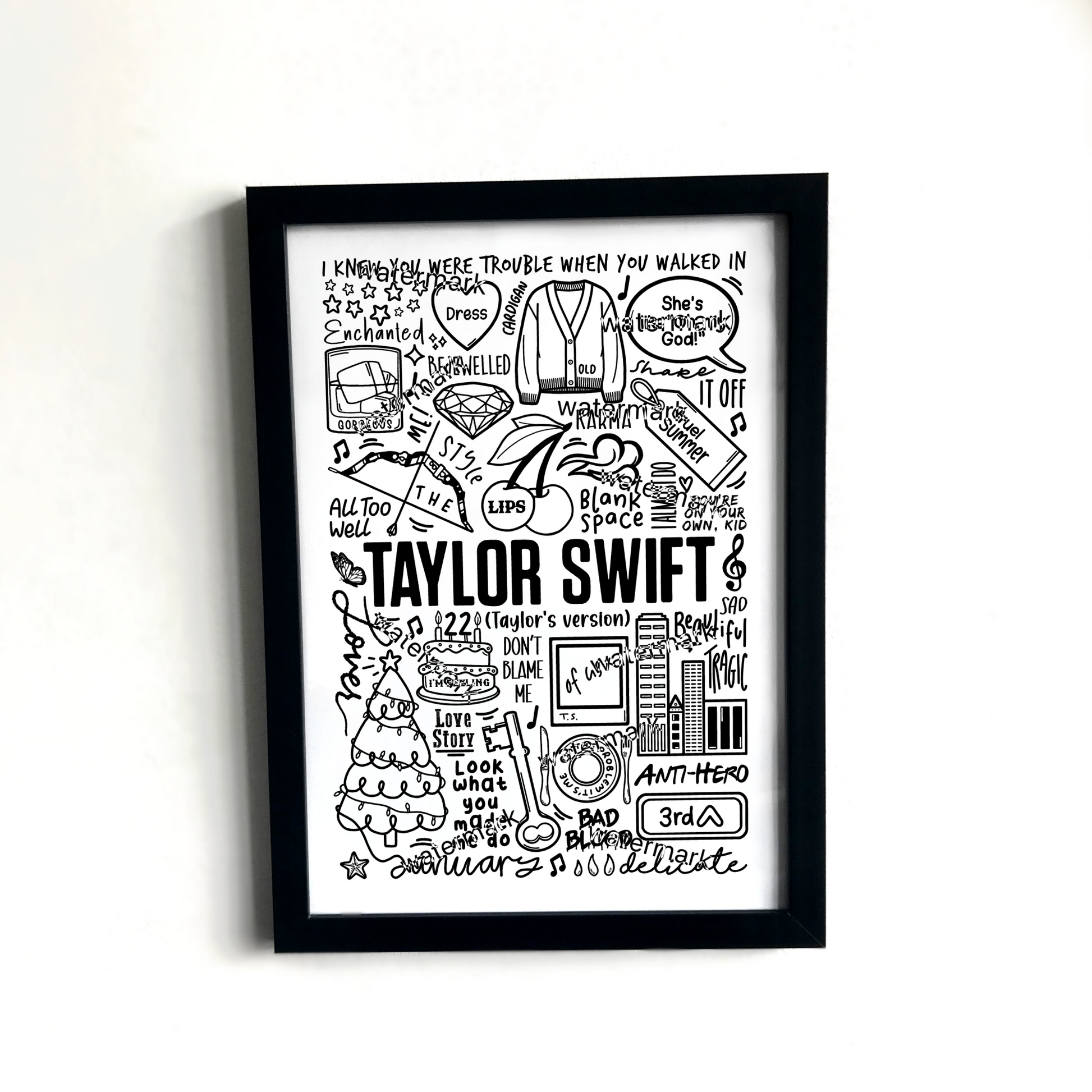 🎶 Art mural de Taylor Swift comprenant des images, des paroles et des titres de chansons de ses albums.