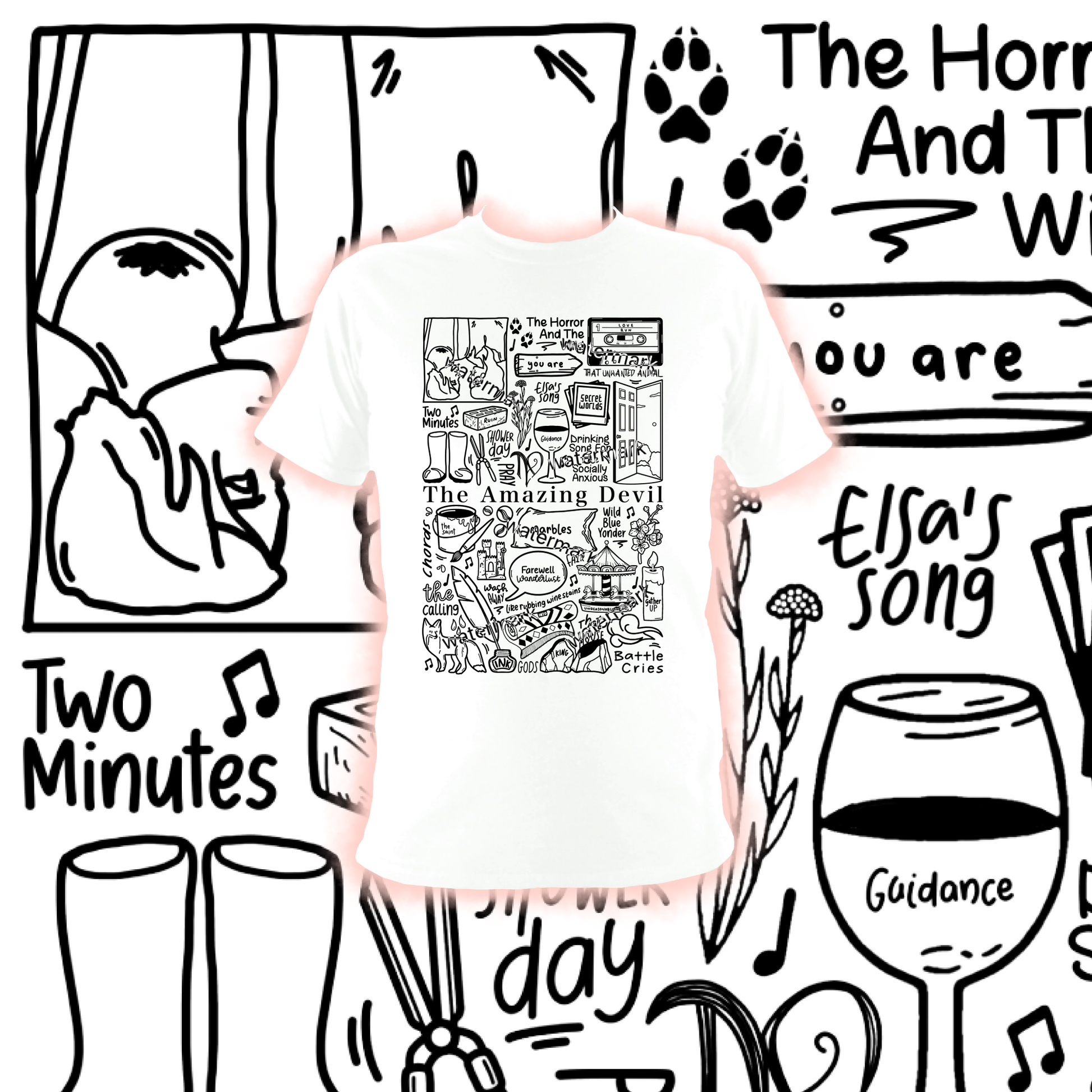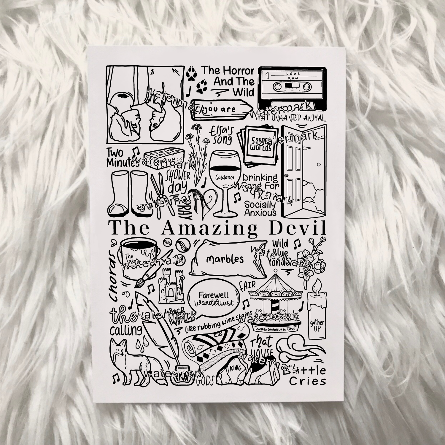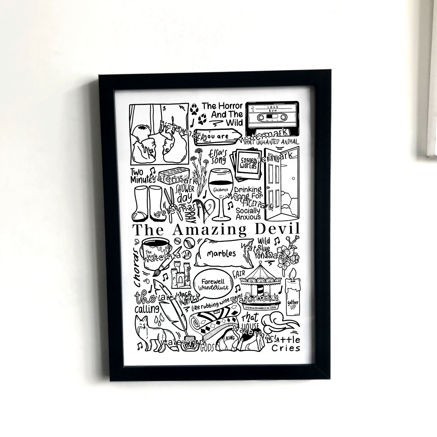 🎶 Affiche imprimée de The Amazing Devil créée à l'aide d'un iPad et d'un Apple Pencil. Elle comprend des images et des paroles de chansons de leurs albums.