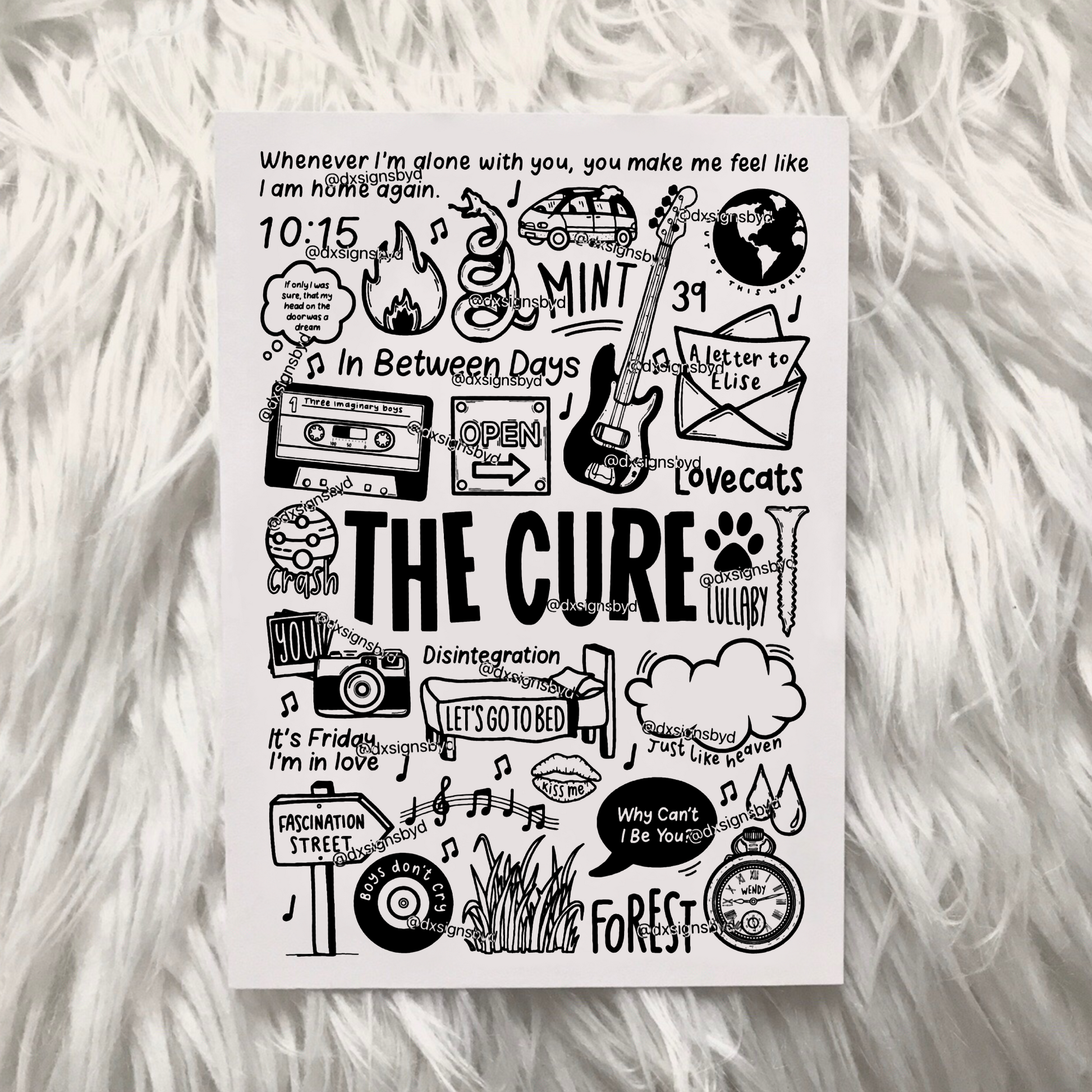 🎶Affiche de The Cure avec des images et des paroles de chansons de leurs albums tels que Three Imaginary Boys, Disintegration, Wish et Faith.