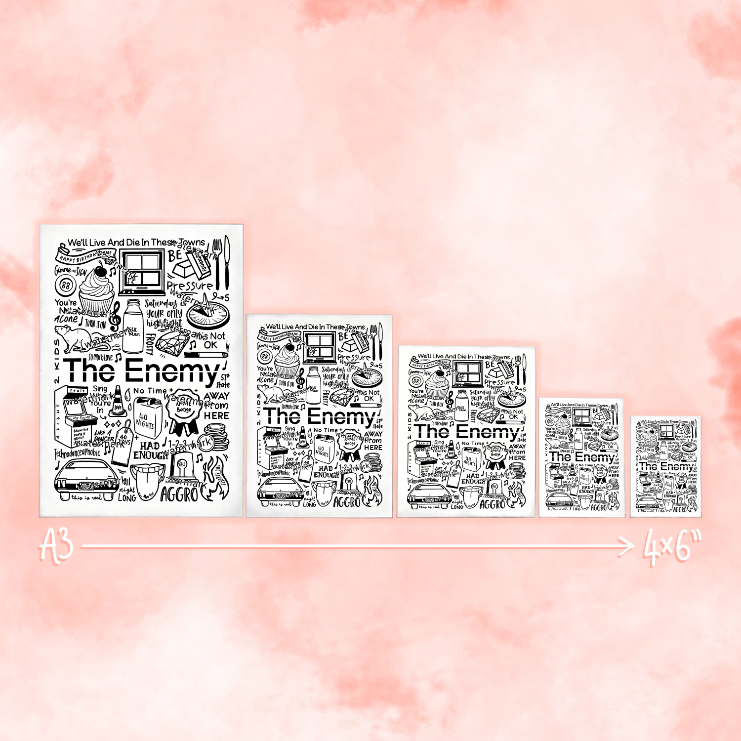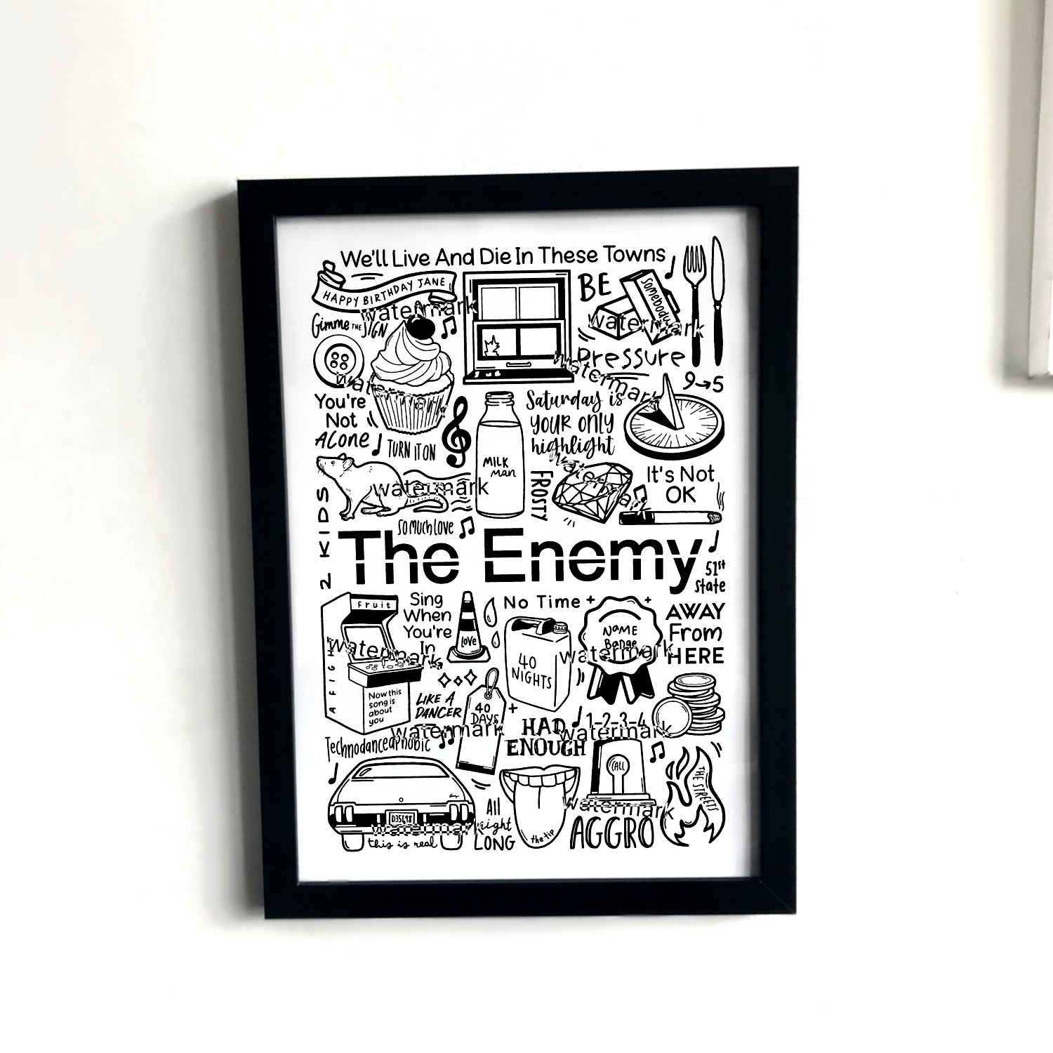 🎶Affiche imprimée du groupe The Enemy créée à l'aide d'un iPad et d'un Apple Pencil. Elle comprend des images et des paroles de chansons de leurs albums.
