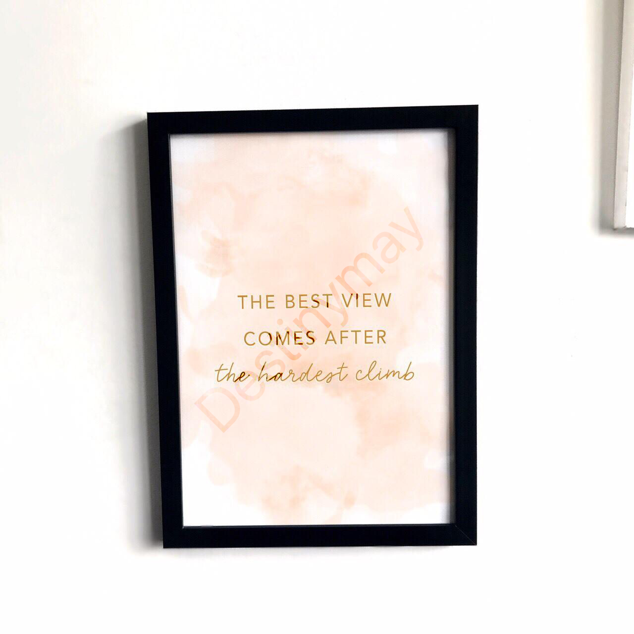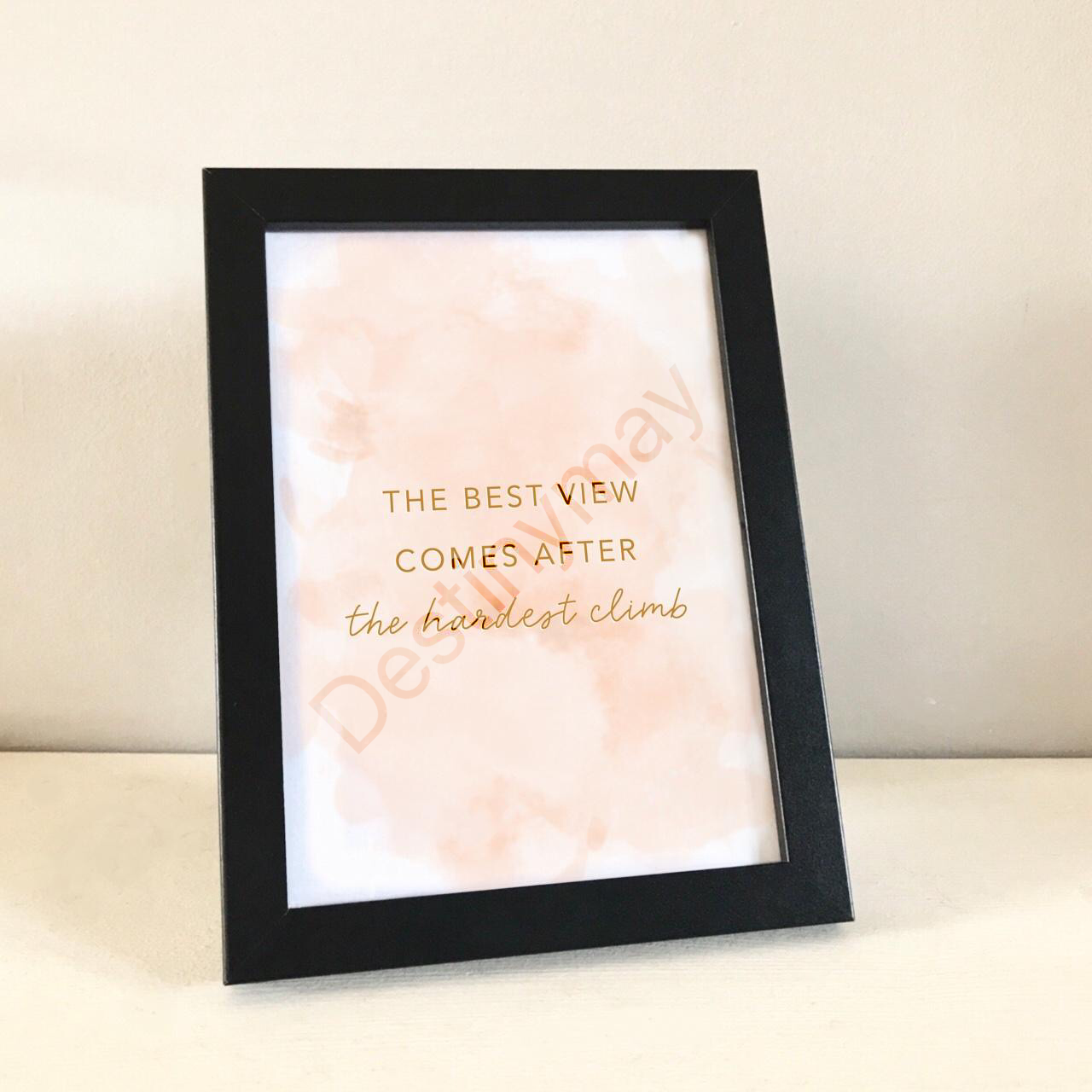 Citation positive et motivante « la meilleure vue vient après la montée la plus difficile » sur un fond aquarelle orange pêche.