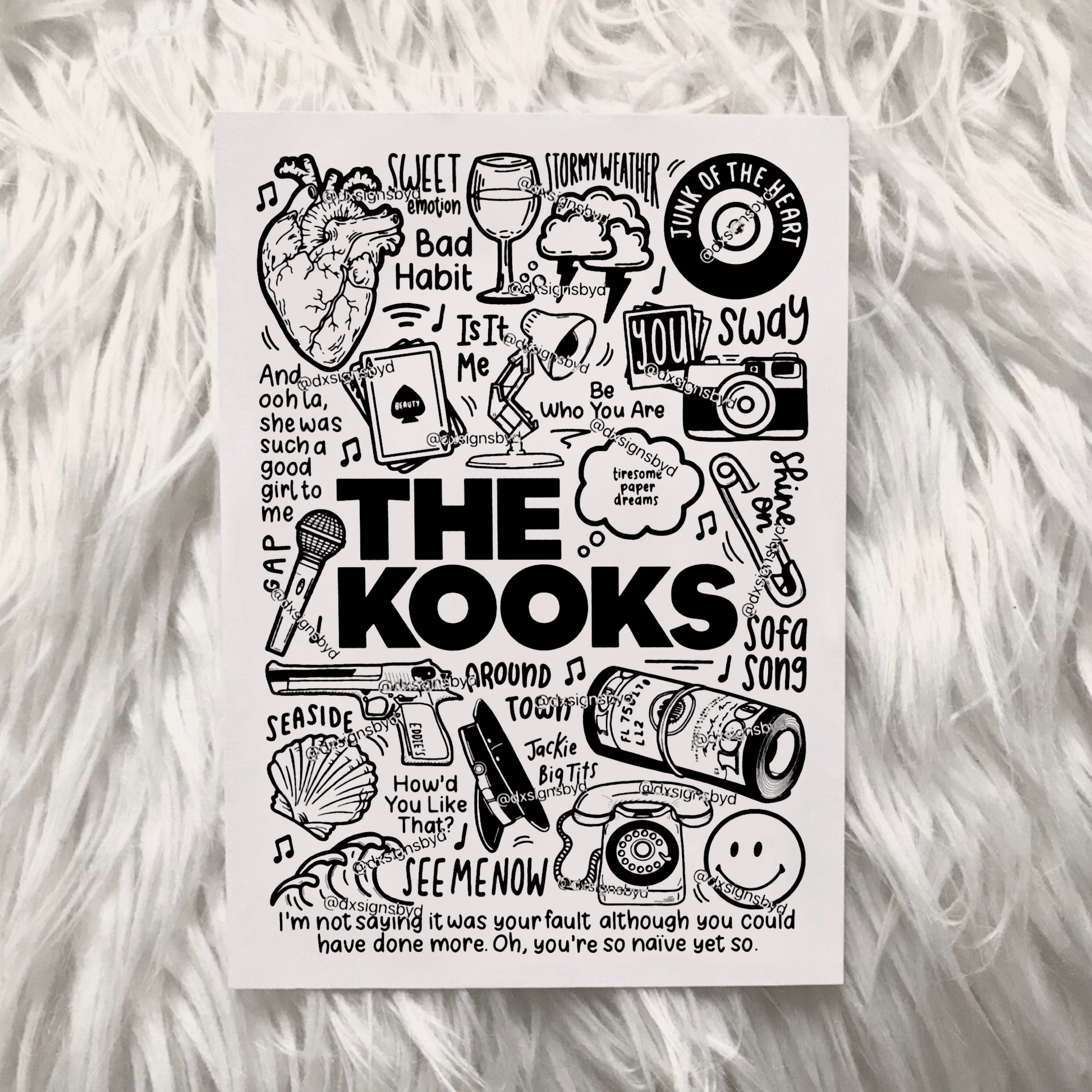 🎶Affiche des Kooks avec des images et des paroles de chansons de leurs albums tels que Inside In/Inside Out, Junk Of The Heart, Listen et Konk.
