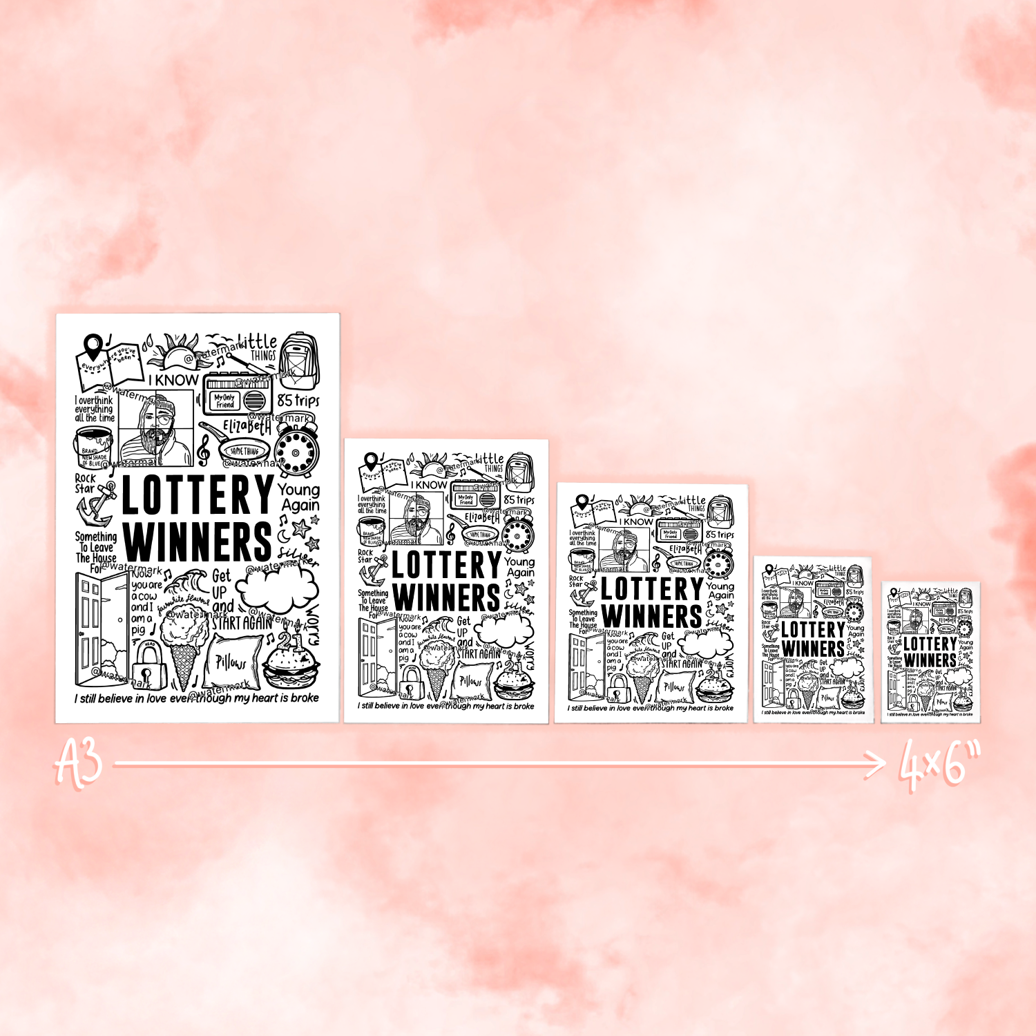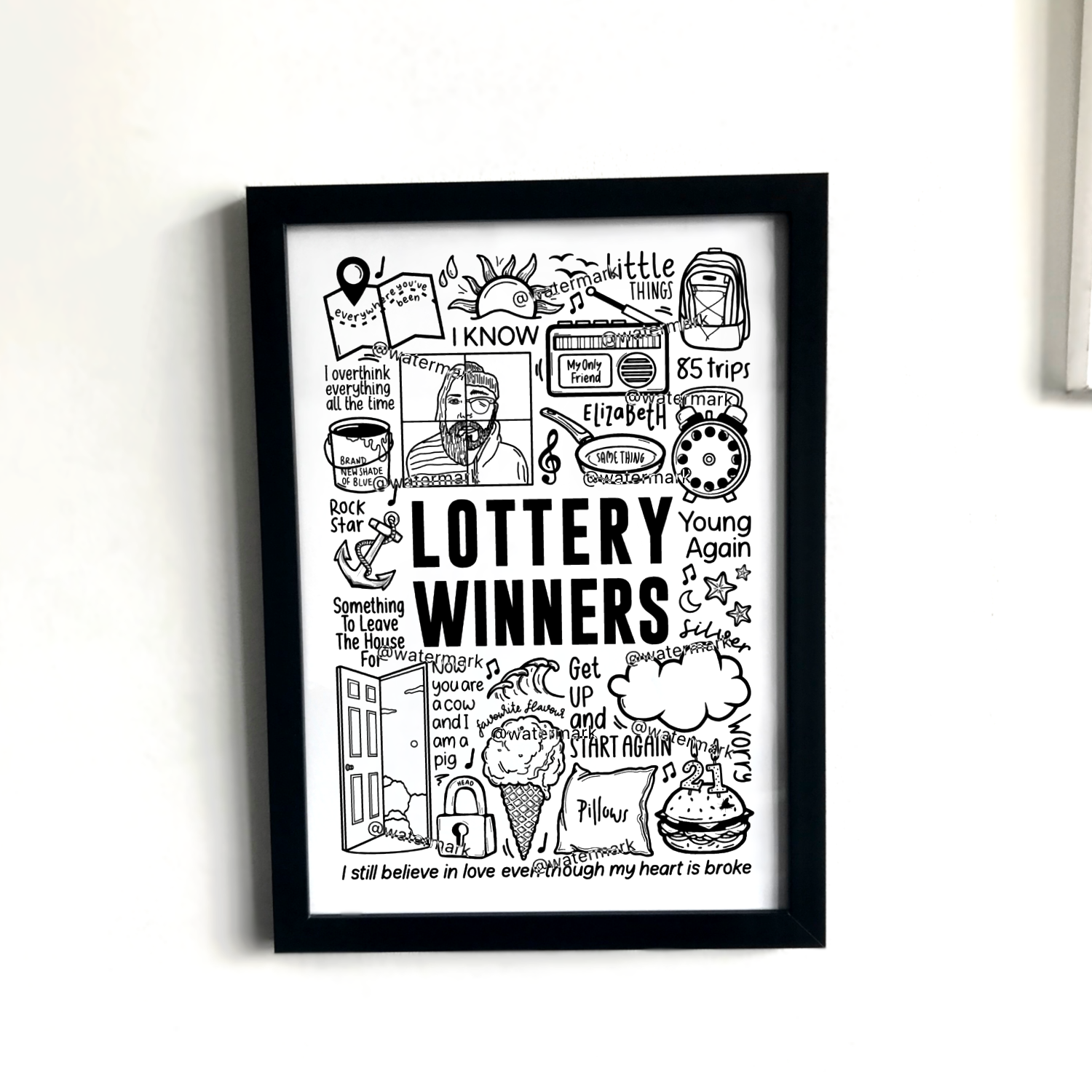 🎶 Affiche des gagnants de la loterie comprenant des images et des paroles de chansons de leurs albums