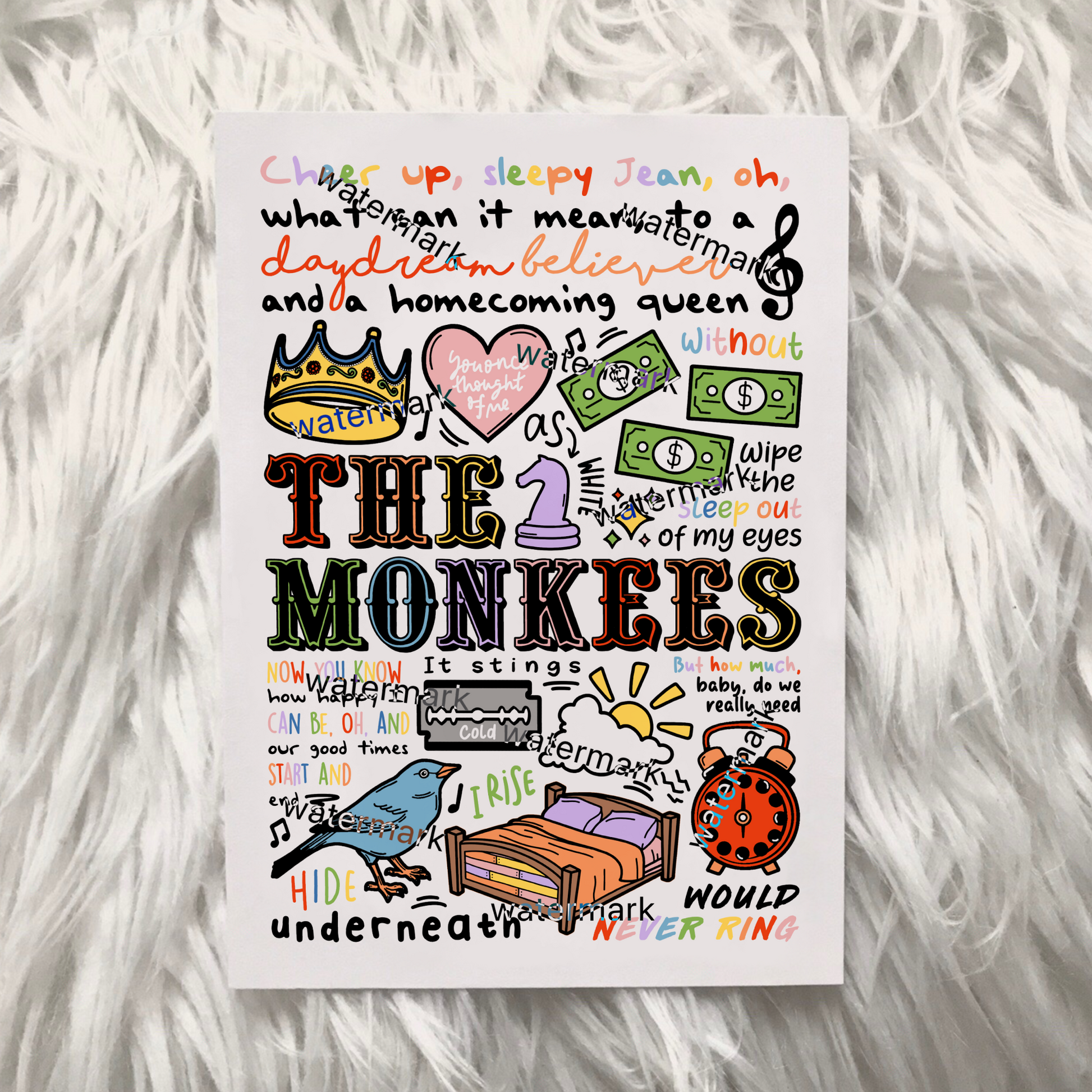🎶Art mural des Monkees comprenant des images et des paroles de leur chanson Daydream Believer.