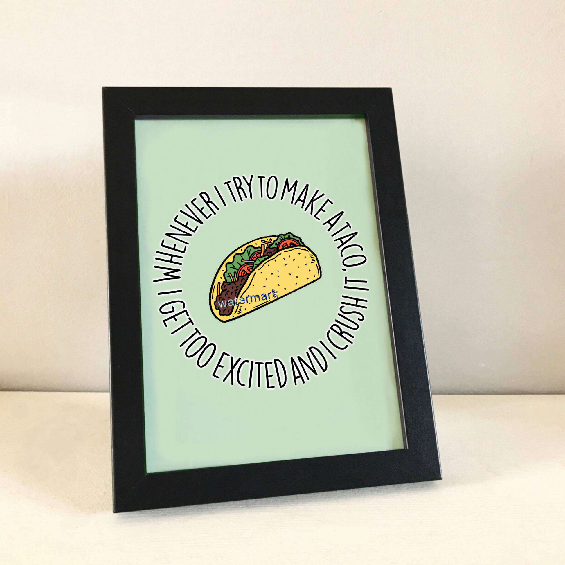 Citation de The Office de Kevin « ...Quand j'essaie de faire un taco, je suis trop excité et je l'écrase » sur fond vert.