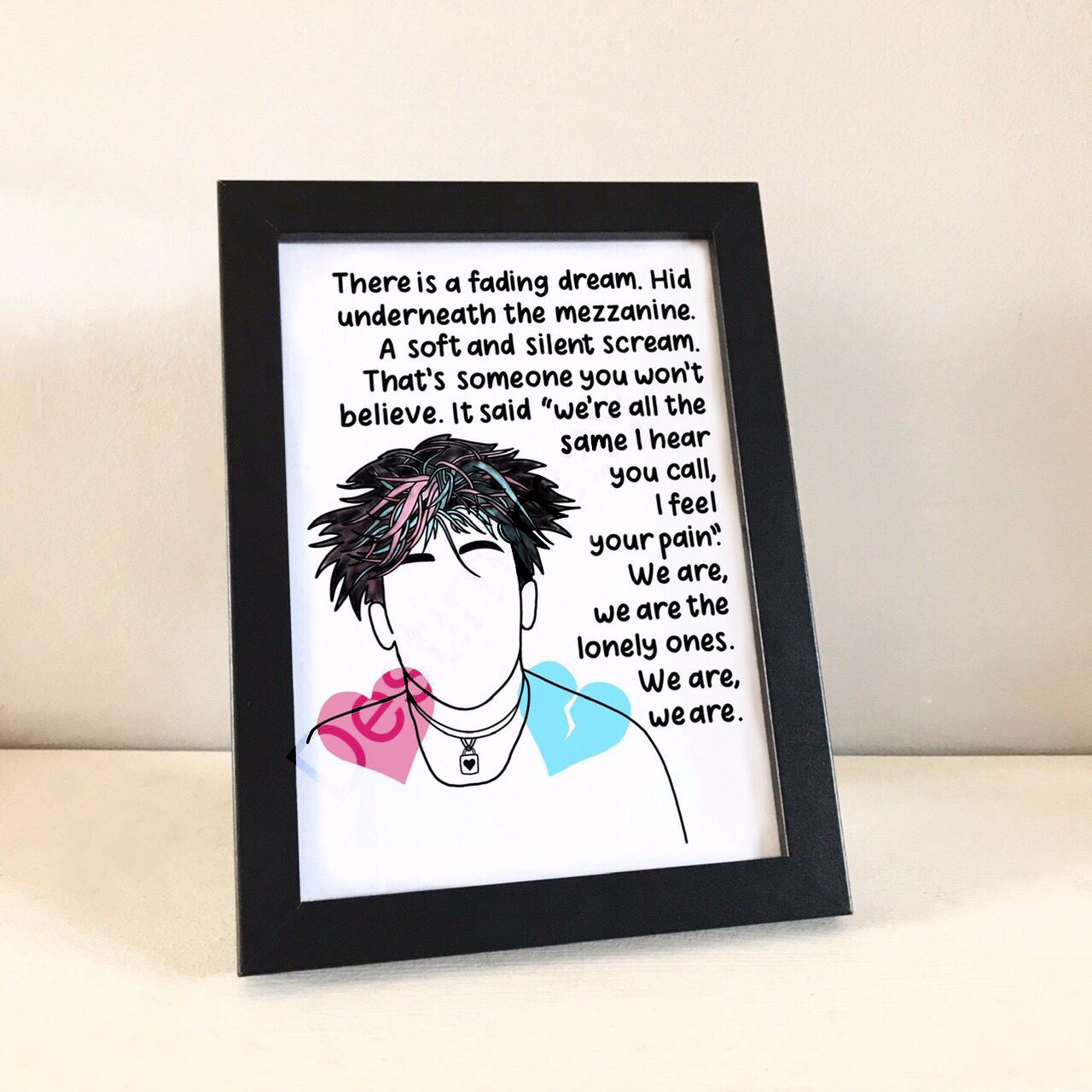 Affiche des paroles de Yungblud avec une image de Dominic Richard Harrison de Yungblud avec ses deux cœurs brisés symboliques, sous les paroles « There is a fading dream.. » de la chanson the lonely and the broken