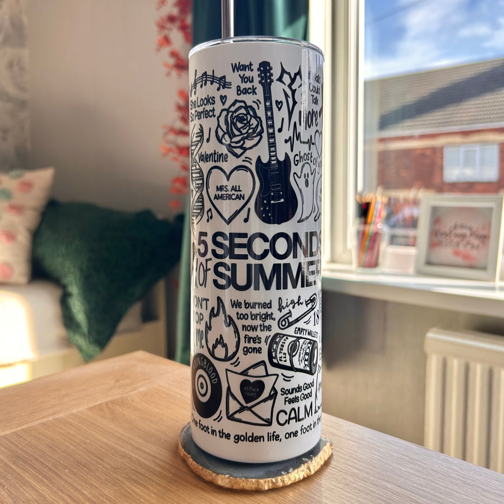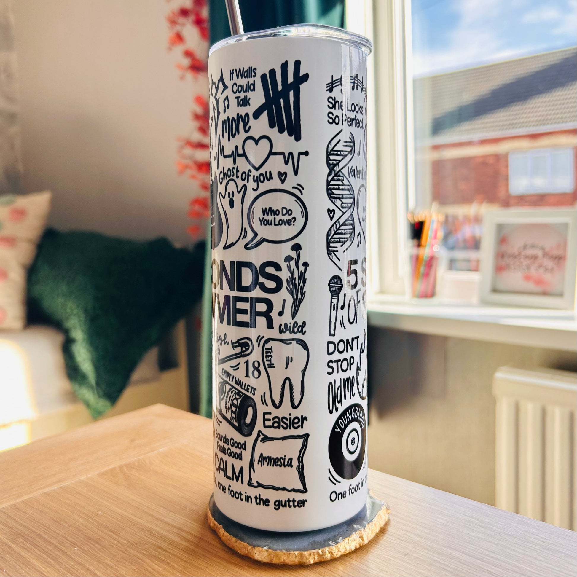🥤Get lyrical with your beverages with our 5SOS travel drinks cup! This versatile cup keeps your drinks hot OR cold and your spirits high with fun lyrics and drawings printed all around the cup. Stay hydrated (and entertained) on the go with our tumblers🥰