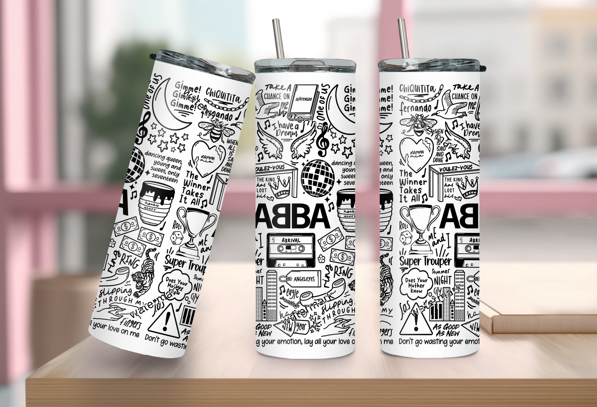 🥤Get lyrical with your beverages with our travel drinks cup! This versatile cup keeps your drinks hot OR cold and your spirits high with fun lyrics and drawings printed all around the cup. Stay hydrated (and entertained) on the go with our tumblers🥰