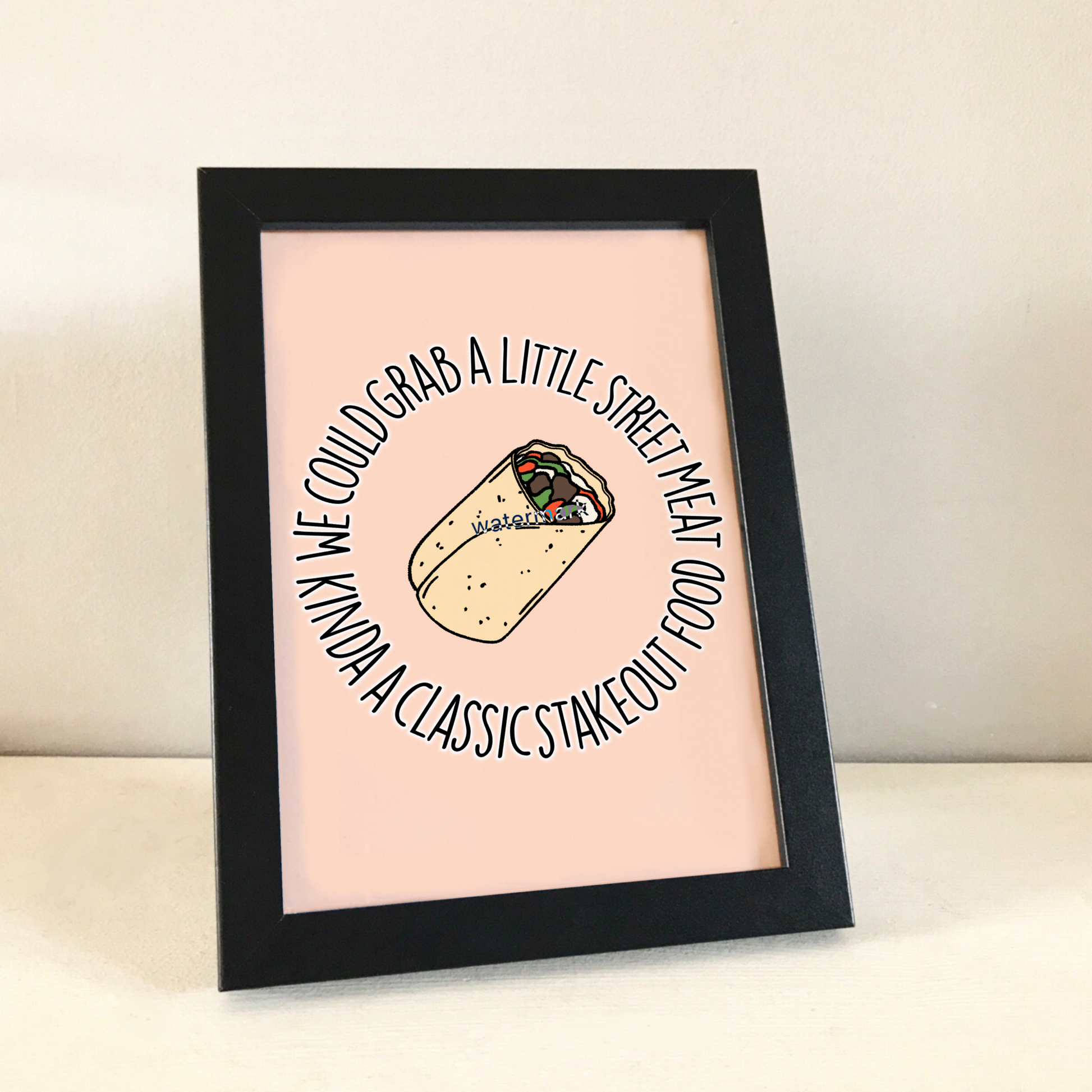 🌯Brooklyn 99 street meat quote ‘We could grab a little street meat, kinda a classic stakeout food’ on a orange background.