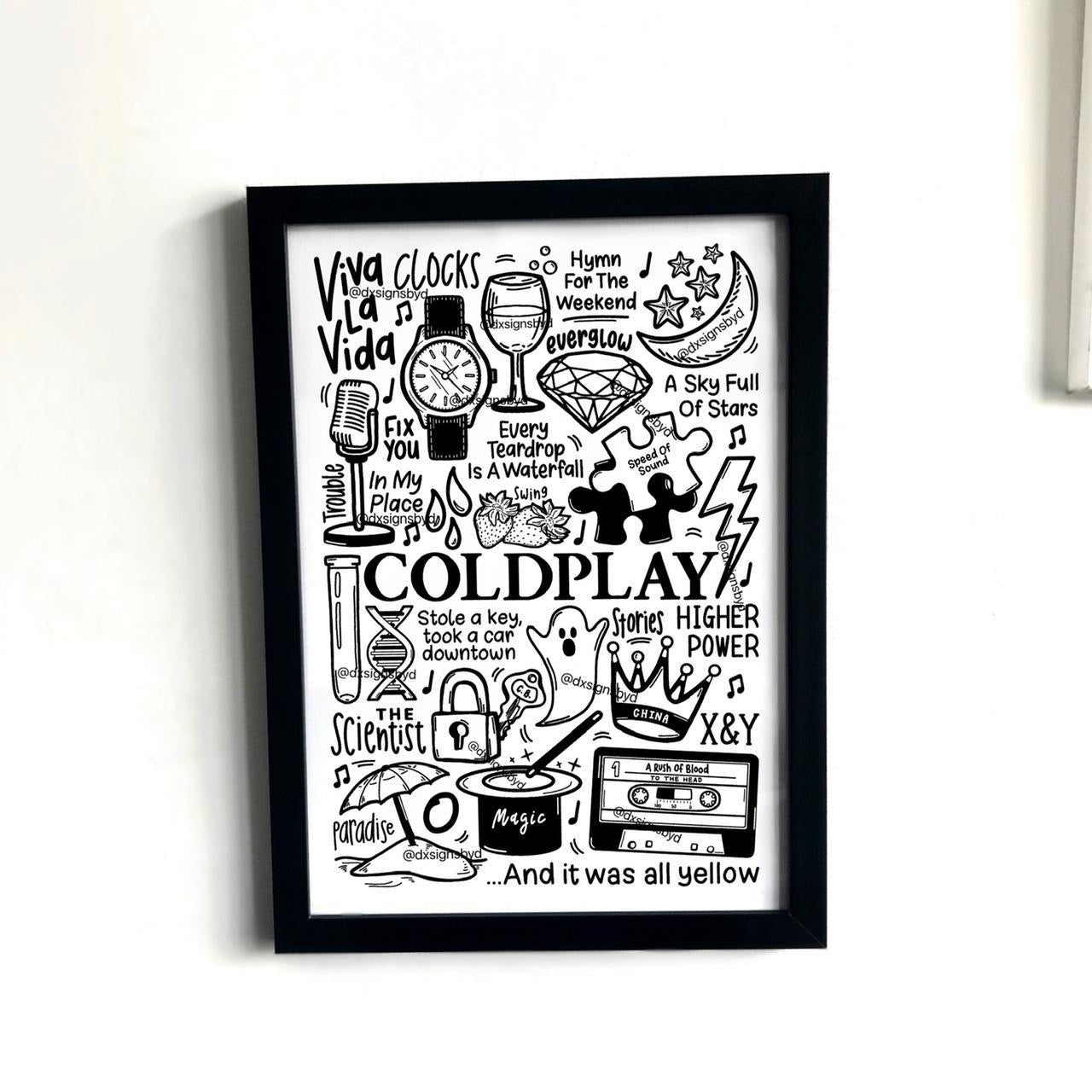 🎶Coldplay poster including images and lyrics of songs from their albums such as Parachutes, A Head Full Of Dreams, X&Y, Ghost Stories, and Mylo Xyloto.