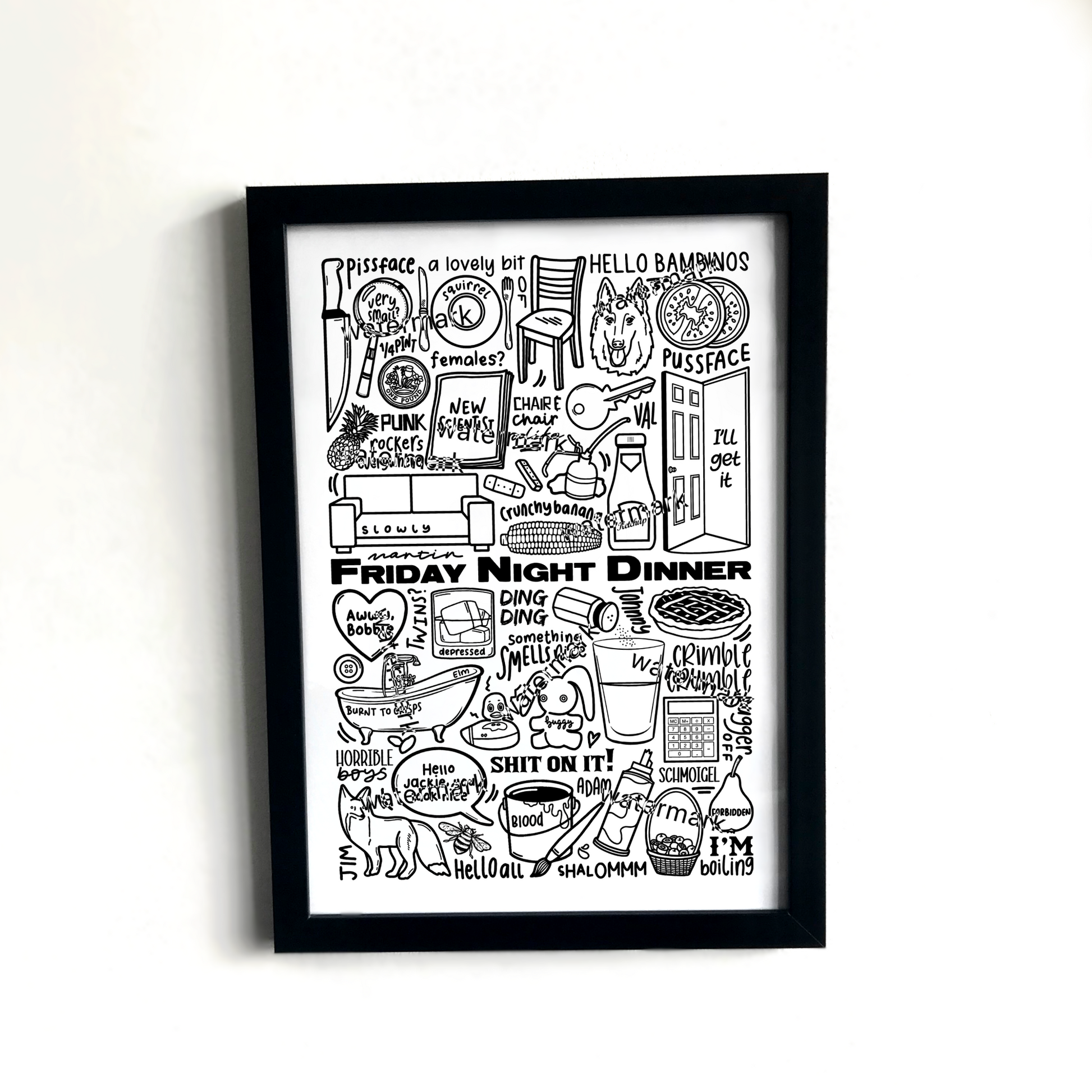 🎶Friday Night Dinner wall art including images, characters, and quotes from the show.