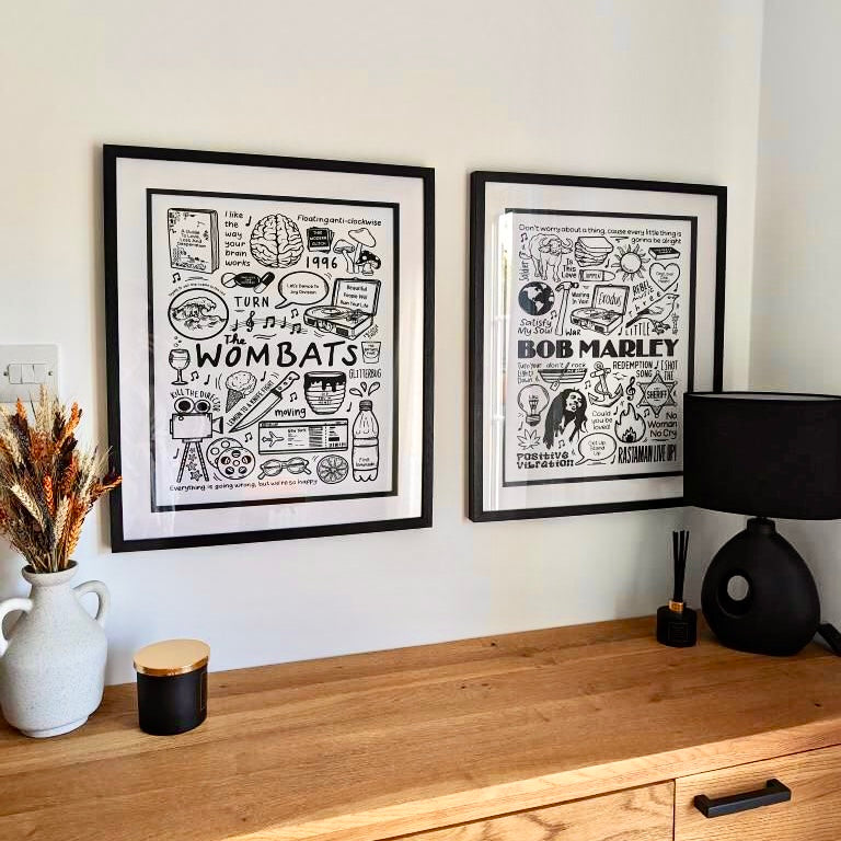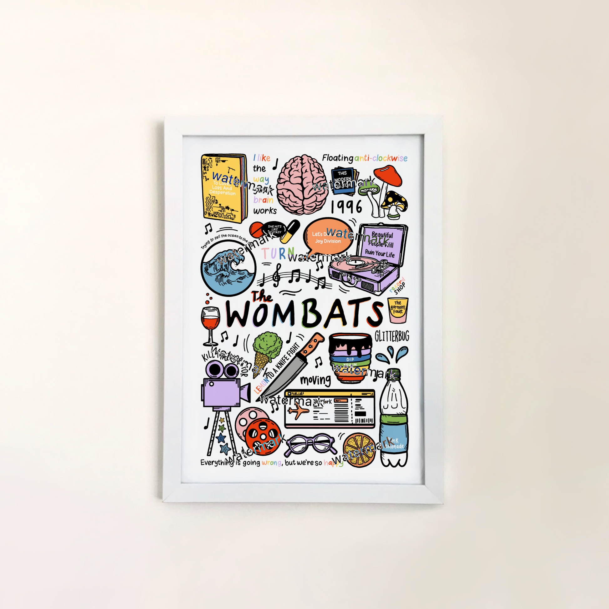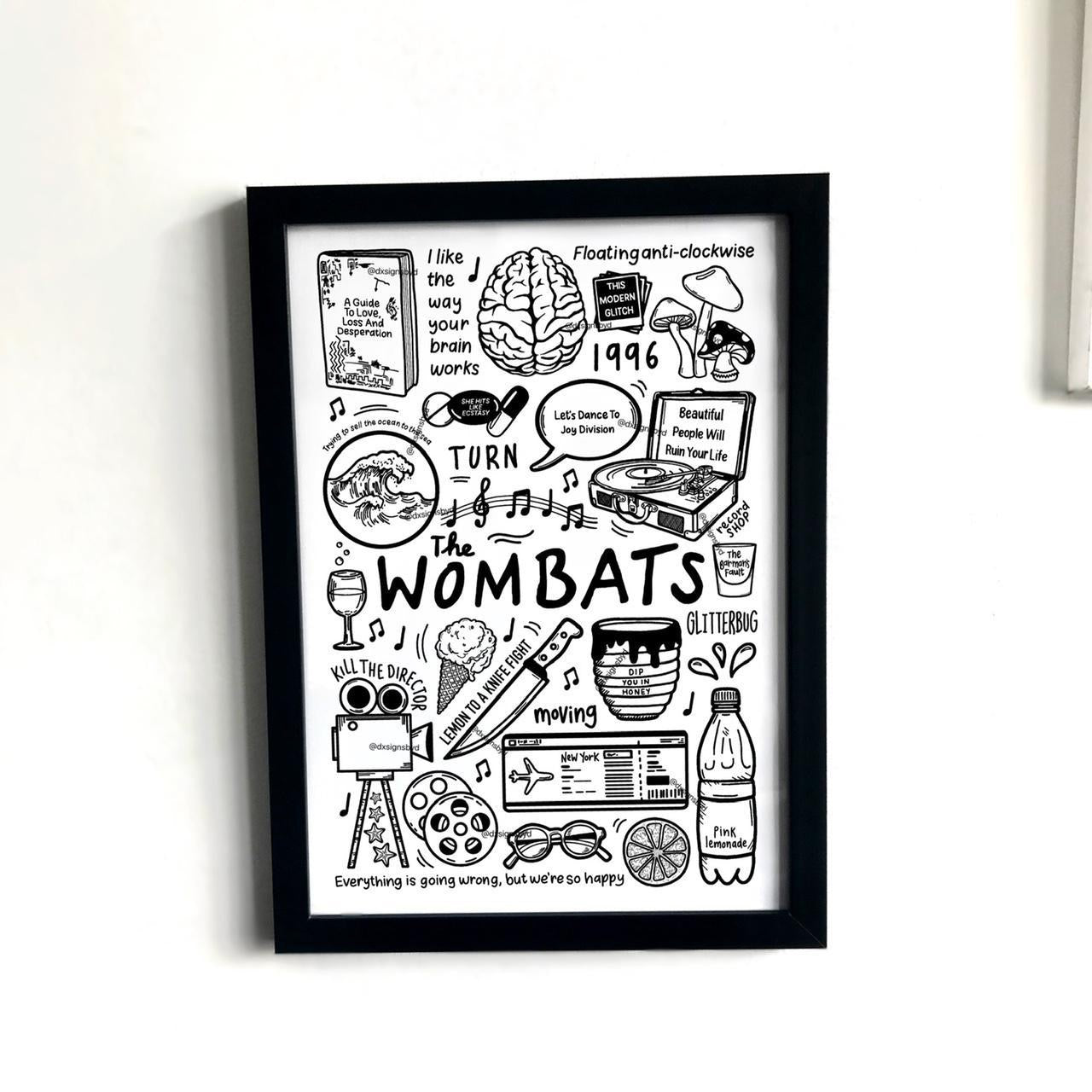 🎶The Wombats poster with images and lyrics of songs from their albums such as Beautiful People Will Ruin Your Life, Glitterbug, and Proudly Present… A Guide to Love, Loss & Depression.