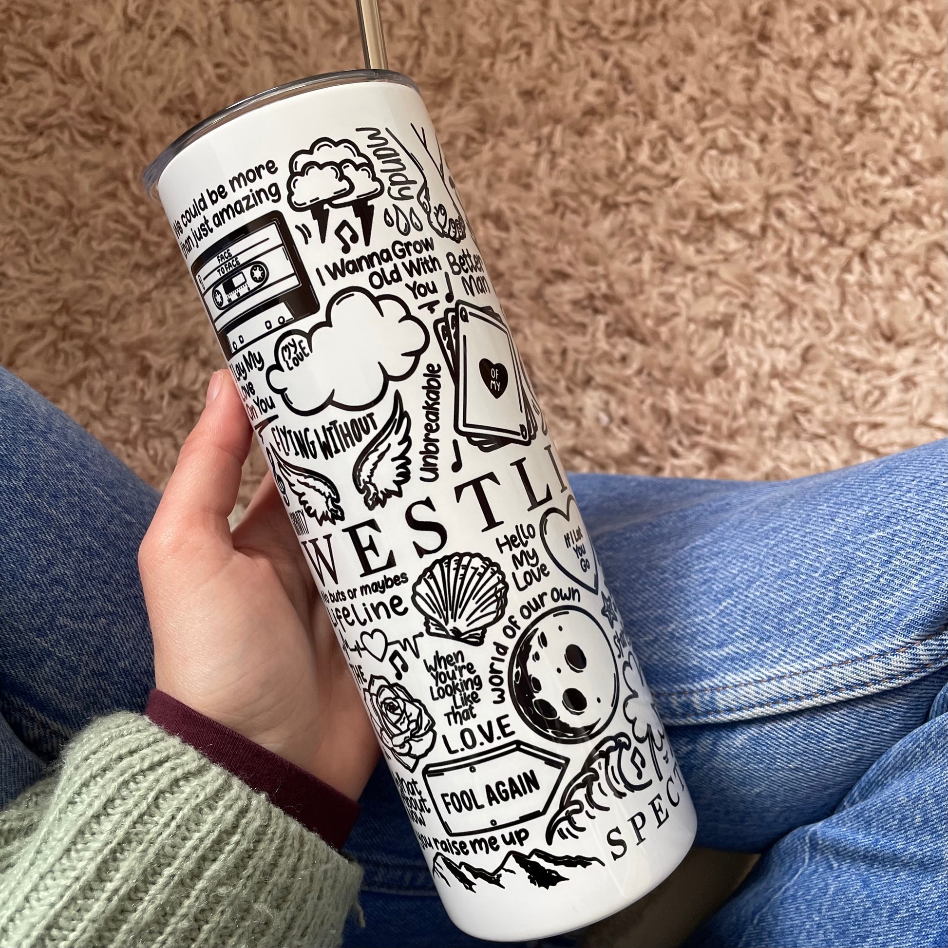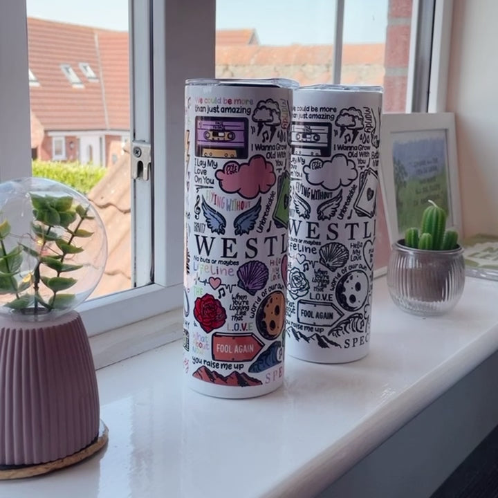 🥤Get lyrical with your beverages with our Westlife travel drinks cup! This versatile cup keeps your drinks hot OR cold and your spirits high with fun lyrics and drawings printed all around the cup. Stay hydrated (and entertained) on the go with our tumblers🥰